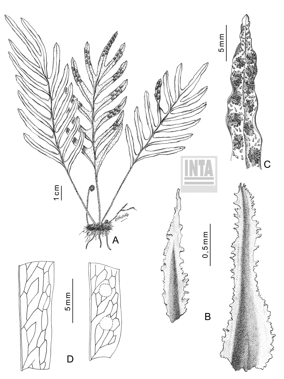 A. Planta. B. Escamas rizomáticas mostrando el área media esclerosada y coloreada. C. Porción de una pinna férti, cara abaxial, mostrando escamas y soros. D. Porción de pinna mostrando la venación.