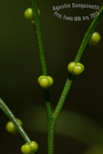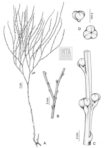 Plantas epífitas o epipétricas; rizomas reptantes, teretes, castaños, con rizoides. Ejes caulinares aéreos erectos a péndulos, de 10-65 cm × 0,8–1,5 mm, angulares al menos distalmente, generalmente de color verde grisáceo a amarillento, con estomas, simples proximalmente, repetidamente ramificados distalmente. Hojas estériles subuladotriangulares, 1-2 mm de largo, herbáceas. Esporofilos profundamente bífidos, con los lóbulos angostamente subulados, de 2-3 mm de largo. Esporangios amarillos, triangular-globosos, 2-3 lobados, de 3-4 mm de diámetro, dispuestos helicoidalmente a lo largo de las aristas de las ramas. Esporas elipsoides con lesura hasta de 2/3 de la longitud total de la espora; perisporio rugulado.