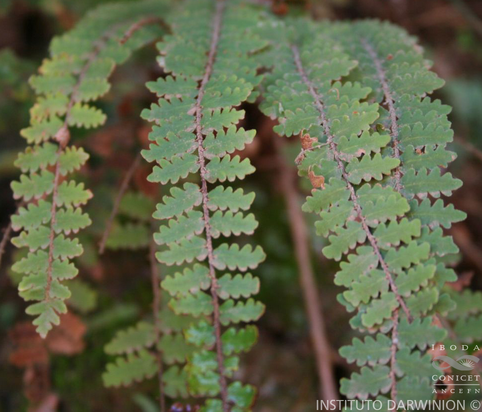 Rizomas cortamente rastreros, con escamas levemente bicolores, denticuladas o ciliadas, sinuosas. Frondes de 15-60 cm de largo, erectas y a veces péndulas, aproximadas; pecíolos breves, ca. 1/5 del largo de la fronde, escamosos; láminas de contorno linear, pinnado-pinnatífidas; raquis teretes, escamosos; pinnas brevemente pecioluladas, elípticas a ovado-triangulares, subenteras a lobuladas, de 8-20 mm de largo, cara adaxial con escamas estrelladas, blanquecinas, esparcidas, a glabrescente, cara abaxial con escamas castaño claras en varias capas, desde ovado-lanceoladas, fimbriadas a estrelladas en las capas internas y con pelos glandulares 2-3-celulares. Esporangios en la porción terminal de las venillas. Esporas 32 en cada esporangio.