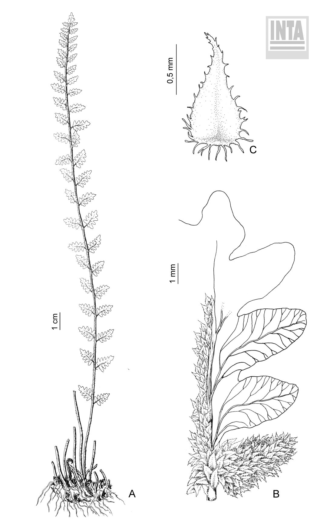 A. Planta. B. Detalle de una pinna mostrando la venación y la cobertura de escamas. C. Escama foliar.
