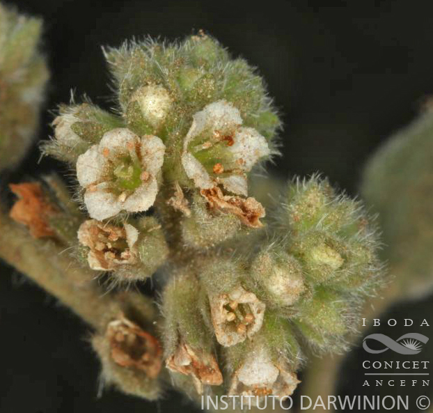 Hierba perenne de 5-20 cm de alto, con pubescencia argenteo-seri´cea. Hojas con pecíolos de 20-30(-90) mm de largo; lámina entera o hasta 7 lobada, de 2,5-6 × 2-4 cm, serícea en ambas superficies, ápice agudo, base cuneada, lóbulo terminal de mayor extensión que los restantes. Inflorescencias formadas por cimas escorpioides pedunculadas, compuestas, multifloras. Flores subsésiles con cáliz hirsuto de 2,5-3 mm de largo, lacinias lanceoladas, ápice agudo; corola tubular, blanca a lila, con tubo de 3-4 mm de largo, piloso en la superficie adaxial, con escamas a cada lado de la inserción de los estambres; estambres inclusos; ovario ovoide, hirsuto-ciliado; estilo piloso en la base, estigmas inclusos. Fruto una ca´psula piriforme, de 2,8-3,2 mm de diámetro, inclusa en el cáliz fructífero. Semillas cimbiformes, de 2 × 0,5-1 mm, foveoladas en ambas superficies.