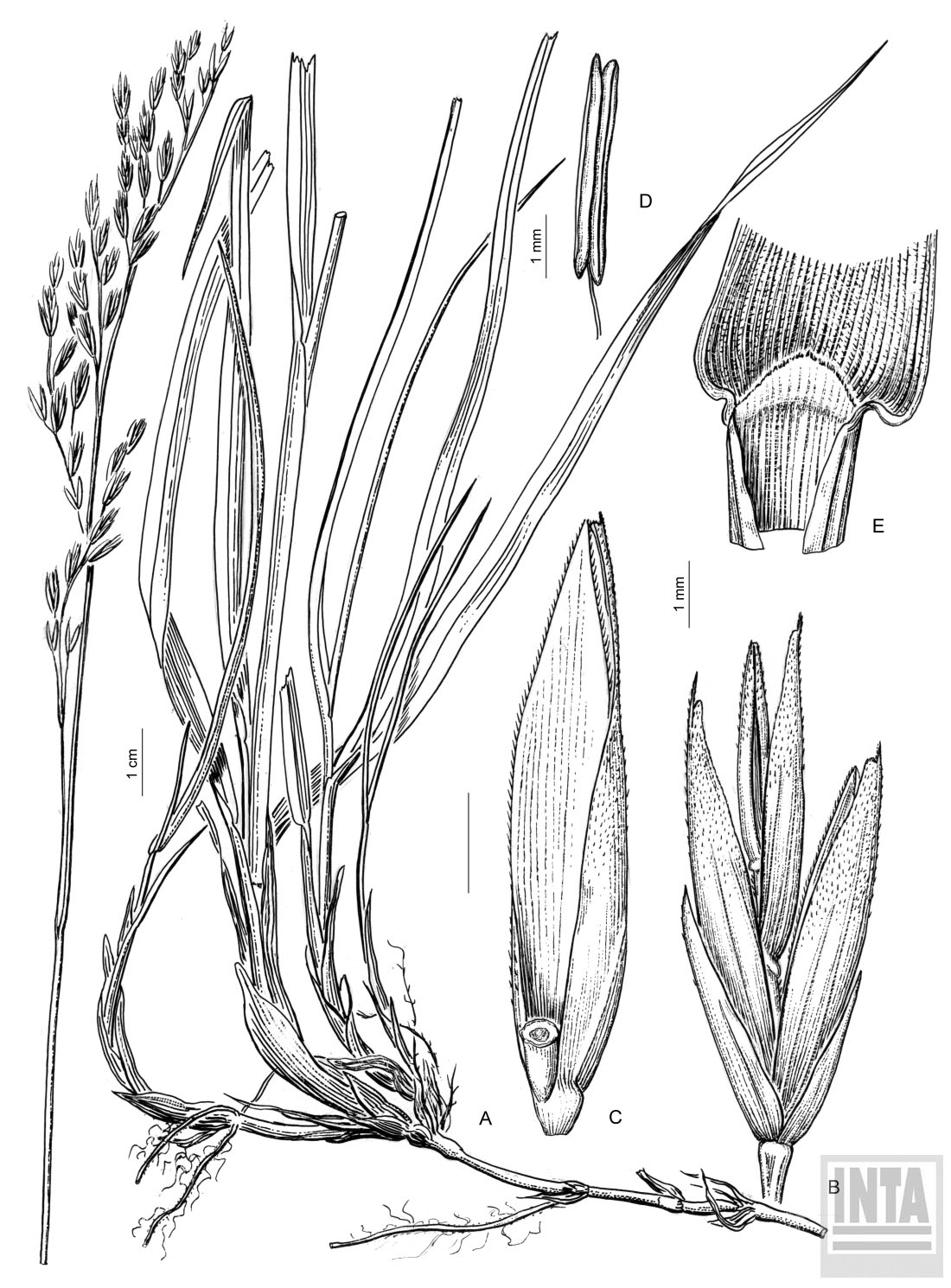 A, planta (parte basal e inflorescencia); B, espiguilla; C, antecio; D, estambre; E, lígula.