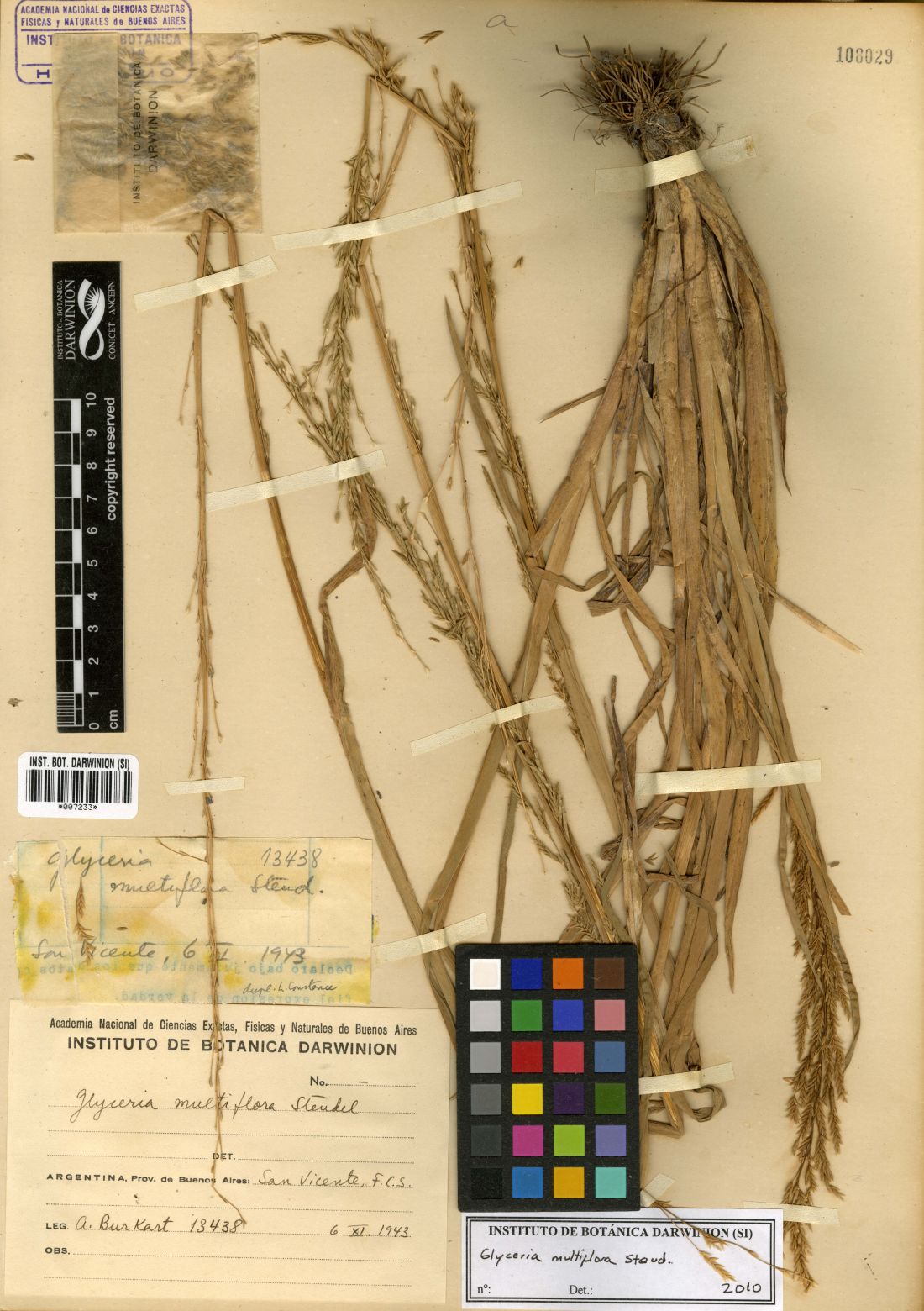 Plantas acuáticas o palustres, suculentas, robustas; cañas de 30-70 cm de alto, erguidas o decumbentes, arraigadas en los nudos inferiores; vainas de 8-18 cm de largo, enteras, glabras; lígulas membranáceas, de 7-15 mm de largo, hialinas, enteras en la prefoliación, truncadas o agudas, borde generalmente lacerado; láminas de 8-30 cm x 4-1,4 mm, glabras, planas o conduplicadas. Inflorescencia de 10-60 cm de largo, contraída, estrecha, erecta o mutante, ramificaciones adpresas, las inferiores hasta de 12 cm de largo. Espiguillas de 1,5-2,5 cm de largo, cilíndricas, (8-)12-15-floras, glabras; gluma inferior de 2-3 mm de largo, glabra; gluma superior de 3-4 mm de largo, glabra; lemma de (3,5-)4-4,5 mm de largo, 7-nervia, nervios prominentes, evanescentes antes del ápice, dorso y nervios finamente escabrosos, ápice membranáceo, generalmente 3-lobado; pálea menor que la lemma, 2-aquillada, quillas poco notables, ápice con 2 dientes diminutos que no alcanzan el ápice de la lemma; lodículas 2, connatas, carnosas; estambres 3, anteras de 0,5-0,7(-1) mm de largo; cariopsis generalmente de 2 mm de largo, castaño-olivácea, surco ventral ensanchado, hilo linear, estipitado, embrión pequeño.