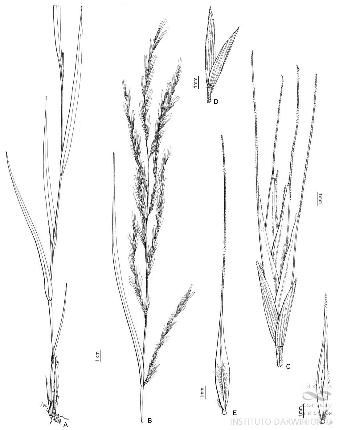 A. Planta (porción basal). B. Caña florífera. C. Espiguilla, vista lateral. D. Glumas. E. Antecio, vista dorsal. F. Pálea, vista ventral.