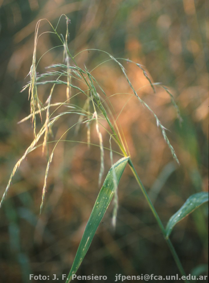 Plantas perennes, rizomatosas, de 0,80-2(-3) m de alto, robustas, ramificadas en la base; nudos glabros; vainas más cortas que los internodios, escabrosas, a menudo pilosas en el cuello; lígulas membranáceas, bordes erosos, de 1-2 mm de largo; láminas planas de 8-30 cm x 5-25 mm, escabrosas en el margen y en la cara adaxial, lisas en la cara abaxial, ralamente pilosas en ambas superficies. Inflorescencia amplia, erguida o nutante, de 10-35 cm de largo, las ramas desnudas en su ½-? inferior, las inferiores hasta de 20 cm de largo, gráciles, simples, raro ramificadas; axila de las ramas glabras. Espiguillas 4-7-floras de 8-10 mm de largo (excluidas las aristas), adosadas a las ramas, sostenidas por los pedicelos de 2-6 mm de largo; callo piloso; raquilla glabra; glumas agudas o subotusas, quillas escabrosas; gluma inferior 1-nervia de 3-5 mm de largo; gluma superior 3-5-nervia, de 4-5 mm de largo; lemma de 6-7 mm de largo, 3-nervia, nervios laterales aproximados al margen, pilosos hasta cerca del ápice, nervio medio piloso en su ½ inferior, aristada, arista apical escabrosa, de 2-7 mm de largo; pálea de igual largo que su lemma o poco menor que ella, los márgenes rala a densamente pilosos; anteras de 1-1,5 mm de largo; cariopsis castaño oscuro, libre entre las glumelas, surcada, de 3-4 mm de largo; mácula embrional ¼-? de su largo, restos de los estilos en el ápice.