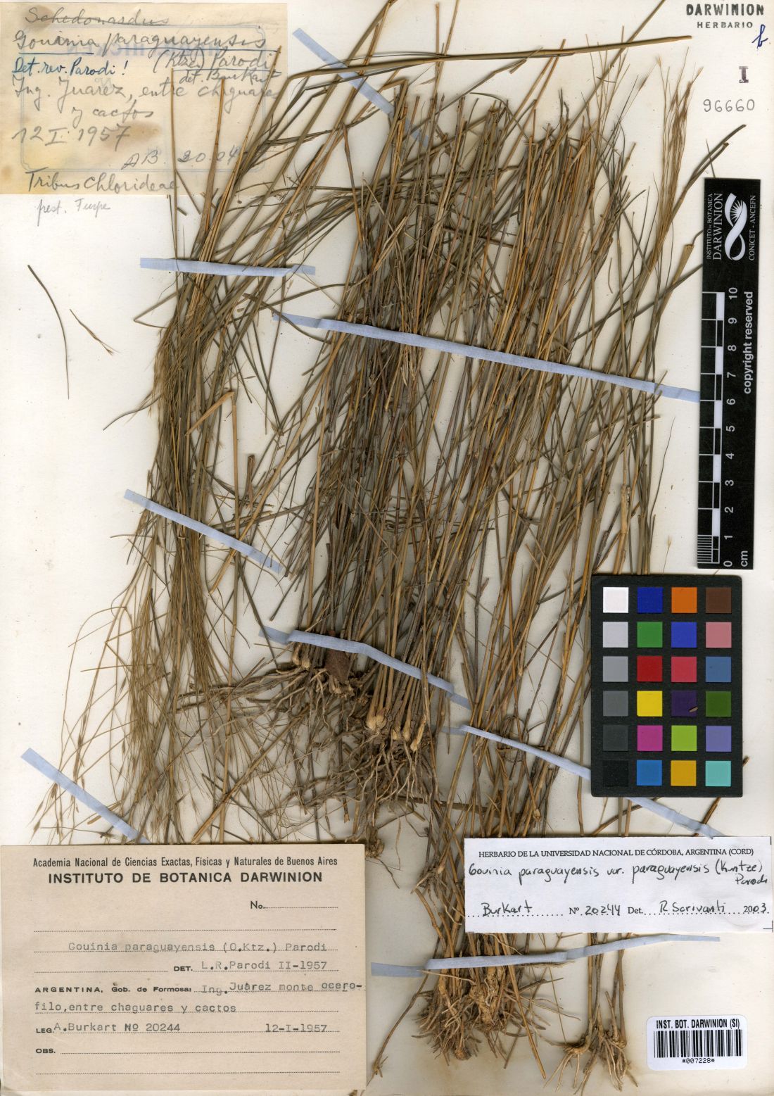 Plantas perennes, rizomatosas; cañas delgadas, erectas, a menudo ramificadas, de 10-80 cm de alto, multinodes, nudos glabros; vainas menores que los internodios, escabrosas, con pelos largos y ralos cerca del cuello y márgenes; lígulas membranáceas, margen ciliado, de 0,5-1 mm de largo; láminas planas, convolutas al secarse, de 2,5-13 cm x 1-5 mm, escabrosas en ambas superficies, terminadas en punta aguda. Inflorescencia erecta de 8-20 cm de largo, exerta o semiincluída en la vaina correspondiente, pauciespiculada; ramas solitarias o verticiladas al menos las basales, divergentes, reflejas a la madurez, desnudas en su parte inferior, las basales de 13-18 cm de largo. Espiguillas solitarias, 2-3-floras, de 5-9 mm de largo (excluidas las aristas), sostenidas por pedicelos rígidos mayores de 4 cm de largo, divergentes de las ramas; glumas acuminadas de 3-5 mm de largo, ambas 1-nervias o la superior 1-3-nervia; lemma lanceolada, acuminada, de 5-9 mm de largo, ápice 2-dentado, dientes de largo variable, 3-nervia, nervios laterales y márgenes glabros, nervio medio piloso en su ½ inferior, aristada, arista escabrosa de 2-13 mm de largo; raquilla glabra; callo piloso; pálea acuminada casi tan larga como su lemma, quillas escabrosas, a menudo terminadas en dos arístulas, márgenes glabros; anteras de 1 mm de largo; cariopsis verde-oscuro o castaño-oscuro, de 3-4 mm de largo.