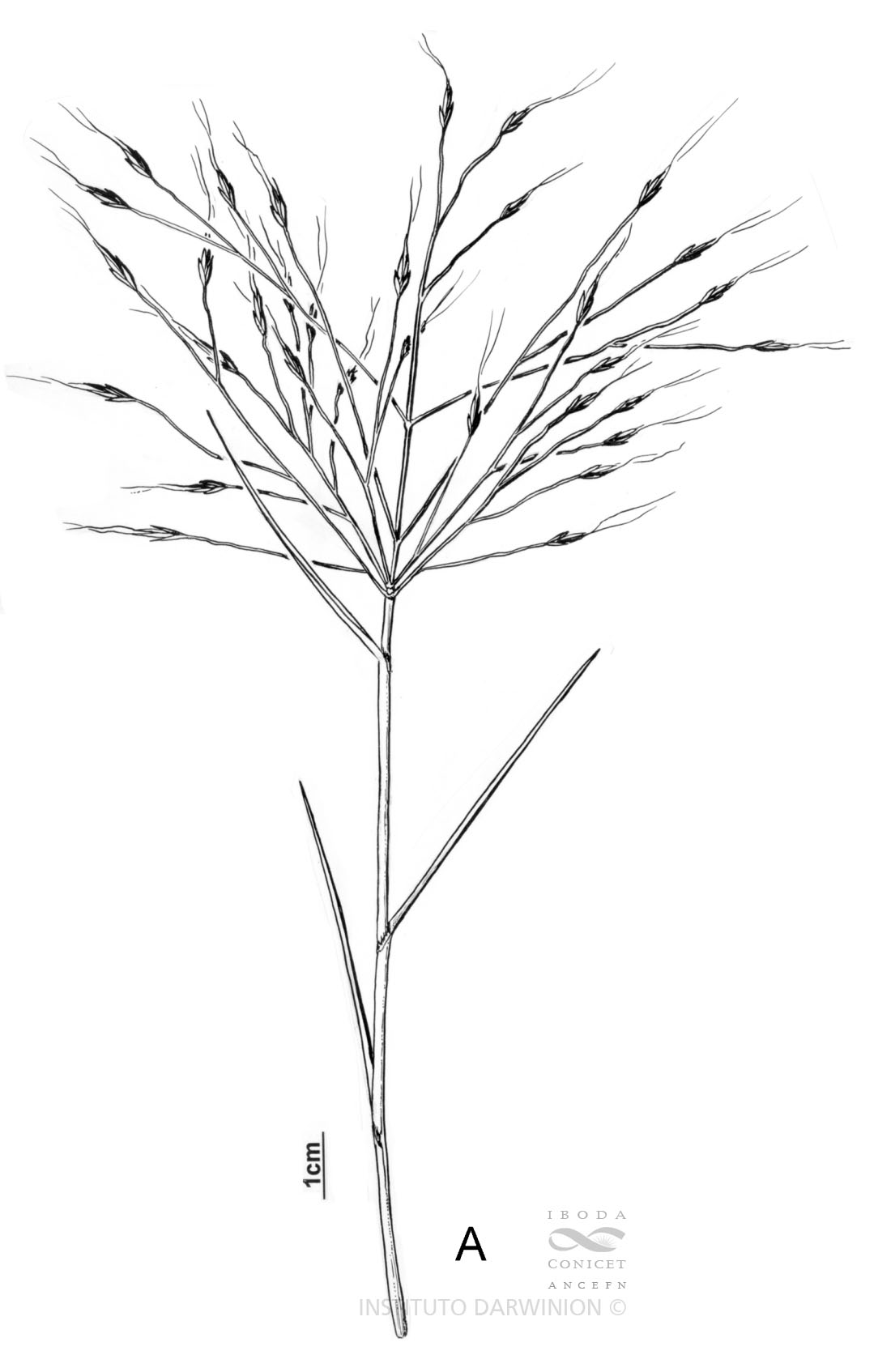 Plantas perennes, rizomatosas; cañas delgadas, erectas, a menudo ramificadas, de 10-80 cm de alto, multinodes, nudos glabros; vainas menores que los internodios, escabrosas, con pelos largos y ralos cerca del cuello y márgenes; lígulas membranáceas, margen ciliado, de 0,5-1 mm de largo; láminas planas, convolutas al secarse, de 2,5-13 cm x 1-5 mm, escabrosas en ambas superficies, terminadas en punta aguda. Inflorescencia erecta de 8-20 cm de largo, exerta o semiincluída en la vaina correspondiente, pauciespiculada; ramas solitarias o verticiladas al menos las basales, divergentes, reflejas a la madurez, desnudas en su parte inferior, las basales de 13-18 cm de largo. Espiguillas solitarias, 2-3-floras, de 5-9 mm de largo (excluidas las aristas), sostenidas por pedicelos rígidos mayores de 4 cm de largo, divergentes de las ramas; glumas acuminadas de 3-5 mm de largo, ambas 1-nervias o la superior 1-3-nervia; lemma lanceolada, acuminada, de 5-9 mm de largo, ápice 2-dentado, dientes de largo variable, 3-nervia, nervios laterales y márgenes glabros, nervio medio piloso en su ½ inferior, aristada, arista escabrosa de 2-13 mm de largo; raquilla glabra; callo piloso; pálea acuminada casi tan larga como su lemma, quillas escabrosas, a menudo terminadas en dos arístulas, márgenes glabros; anteras de 1 mm de largo; cariopsis verde-oscuro o castaño-oscuro, de 3-4 mm de largo.