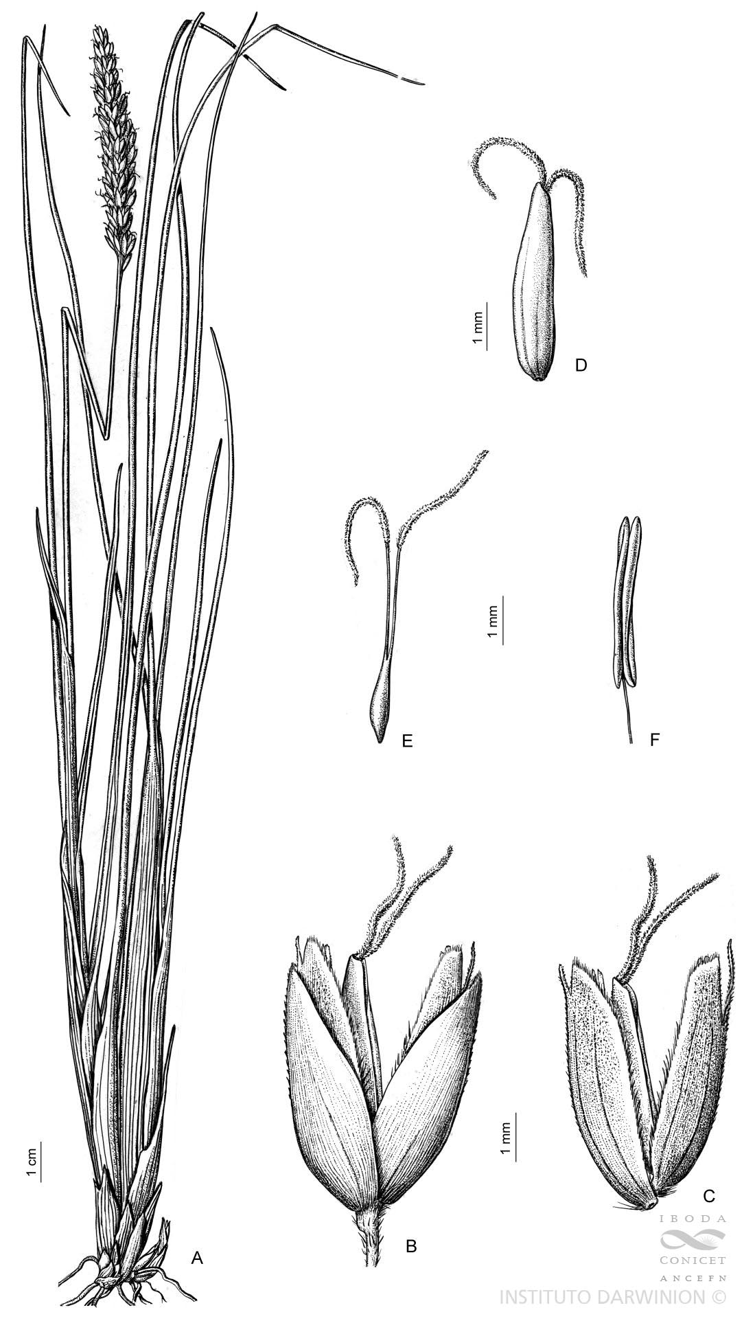 A. Planta. B. Espiguilla, vista lateral. C. Antecios, vista lateral. D. Antecio pistilado. E. Gineceo. F. Estambre.