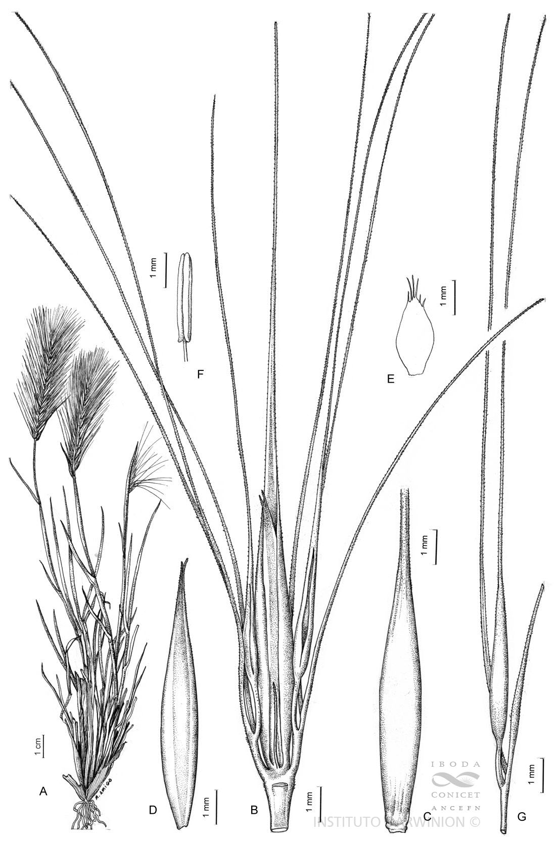 A. Planta. B. Tríade de espiguillas, vista ventral. C. Antecio fructífero, visto por el dorso de la lemma. D. Pálea, vista dorsal. E. Lódícula. F. Estambre. G. Antecio lateral.