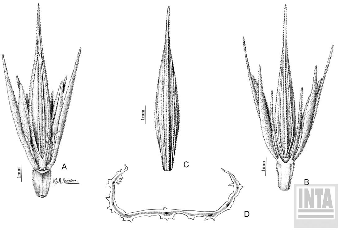 A, tríade de espiguillas, con el antecio fructífero en vista ventral; B, tríade de espiguillas, con el antecio fructífero en vista dorsal; C, lemma, vista dorsal; D, transcorte esquemático de la lemma fructífera.