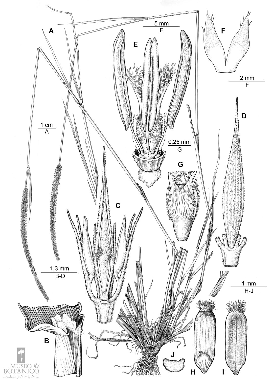 Hordeum cordobense. A. Hábito. B. Lígula. C. Tríades de espiguillas vistas desde ventral; la central, perfecta (de frente a la pálea). D. Espiguilla fértil; la central vista desde la lemma. E. Flor perfecta con lodículas. F. Lodículas. G. Ovario mostrando la base de los estigmas sésiles de nacimiento subapical. H-J. Cariopsis, vista escutelar, hilar y transcorte respectivamente.