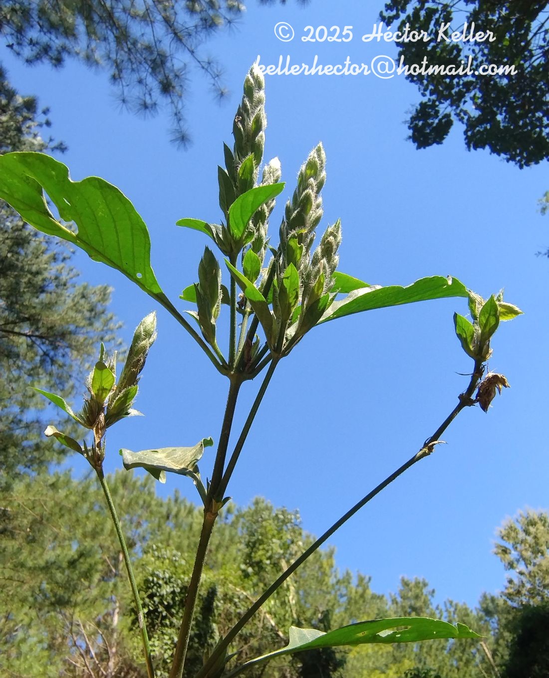 Observaciones: Justicia ramulosa se caracteriza por sus flores rojo-moradas en espigas densas con brácteas imbricadas, elípticas.