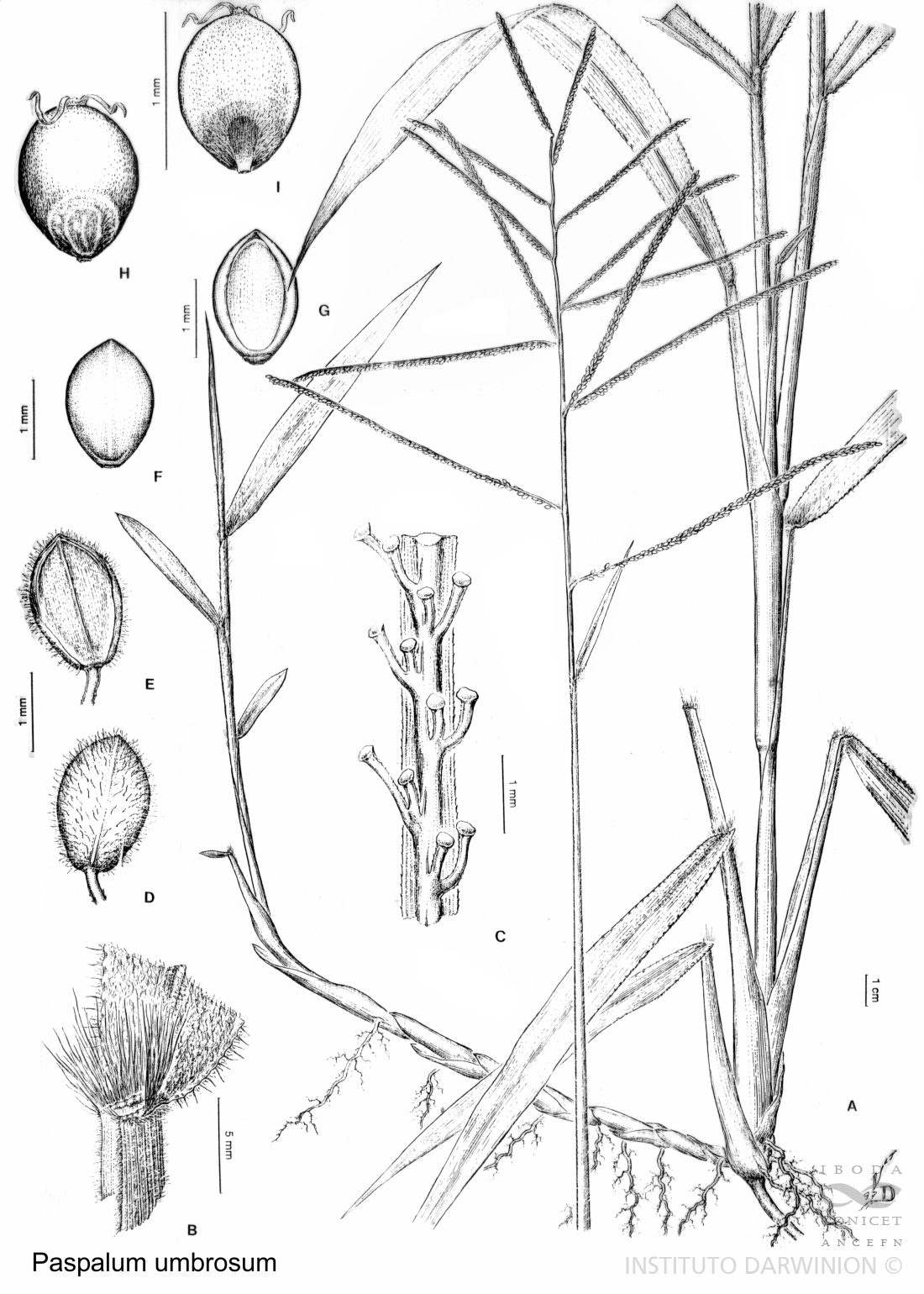 A. Planta. B. Región ligular. C. Porción de un racimo de la inflorescencia. D. Espiguilla vista dorl. E. Espiguilla vista ventral. F. Antecio superior vista dorsal. G. Antecio superior vista ventral. H. Cariopsis vista escutelar. I. Cariopsis vista hilar.