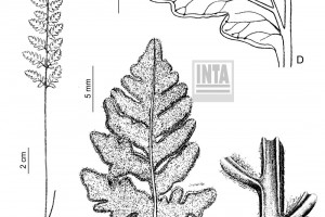 Rizomas rastreros, ramificados, con escamas subuladas, esclerosadas, de ápice capilar. Frondes aproximadas a lo largo del rizoma, de 15-30 cm de largo; pecíolos 1/2 del largo de la fronde o más, acanalados adaxialmente, castaño oscuros a negros, glabrescentes; láminas linear-triangulares, pinnado-pinnatífidas; raquis acanalados y con aristas laterales; pínnulas triangulares u ovado-triangulares, pecioluladas, pilosas a glabrescentes en la cara adaxial, densamente pilosas a lanoso-afelpadas en la cara abaxial, pelos simples, paucicelulares, de 1-2 mm de largo; venas libres, furcadas, algo ensanchadas en el ápice. Pseudoindusios subcontinuos, verdosos, de margen entero. Esporas crestadas.