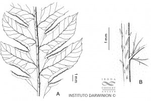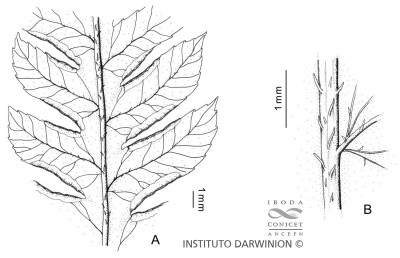 Rizomas brevemente rastreros a suberectos, de 2-5 cm de diámetro. Frondes de 1-1,5 m de largo; pecíolos 1/2 de la longitud de la fronde o más, pajizos a castaños, generalmente ásperos, muricados; láminas deltadas, pedadas, ternadas en la base, pinnado-pinnatifidas, pinnas pecioladas; pinnas proximales 2-pinnado-pinnatifidas, pinnas medias 1-pinnadopinnatifidas, pinnas distales pinnatífidas; segmentos subcoriáceos a papiráceos, de 11-17 × 4-6 mm, con márgenes aserrados, costas dorsalmente surcadas, con procesos espinosos a la salida de las cóstulas sobre el lado adaxial, abaxialmente con diminutas espinas antrorsas blanquecinas; venación simple a 1-furcada; cenosoros ausentes en la base y ápice de los segmentos, pseudoindusios angostos, chatos, de 0,5 mm de ancho. Esporas rugadas, de 30-40 µm de diámetro ecuatorial.