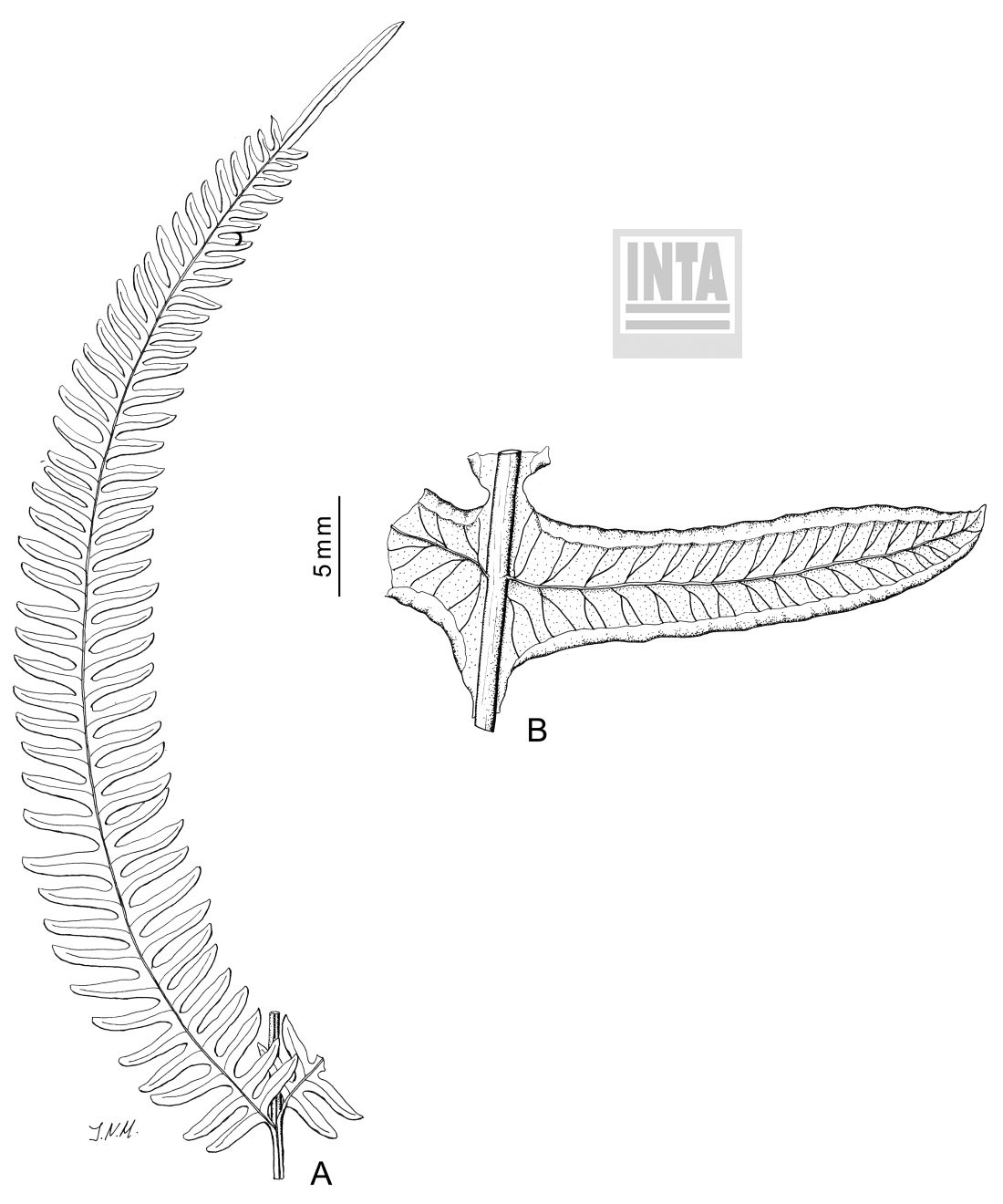A. Pinna. B. Pínnula, cara abaxial, mostrando la venación y margen reflexo.