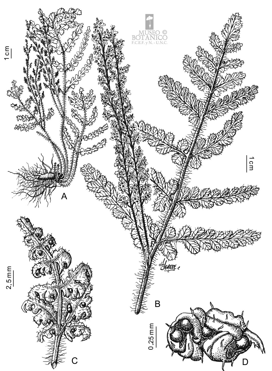 A. Planta. B. Fronde con pinnas basales fértiles. C. Porción apical de una pinna fértil. D. Detalle de un segmento foliar fértil mostrando la posición de los esporangios.