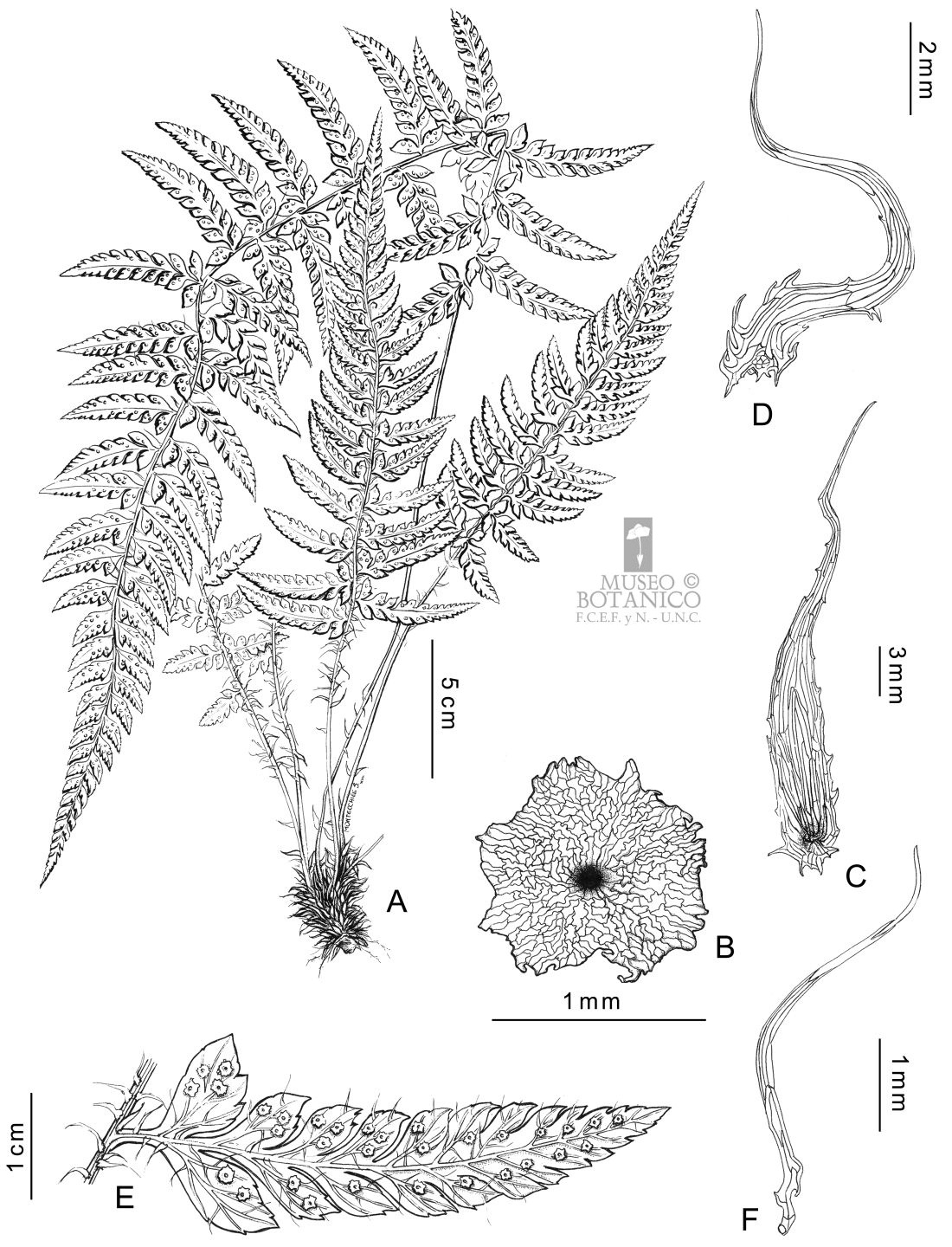A. Planta. B. Indusio, vista superior. C. Escama de la porción basal del pecíolo. D. Escama del raquis. E. Pinna, cara abaxial, mostrando los soros e indumento. F. Escama del envés de las pínnulas.