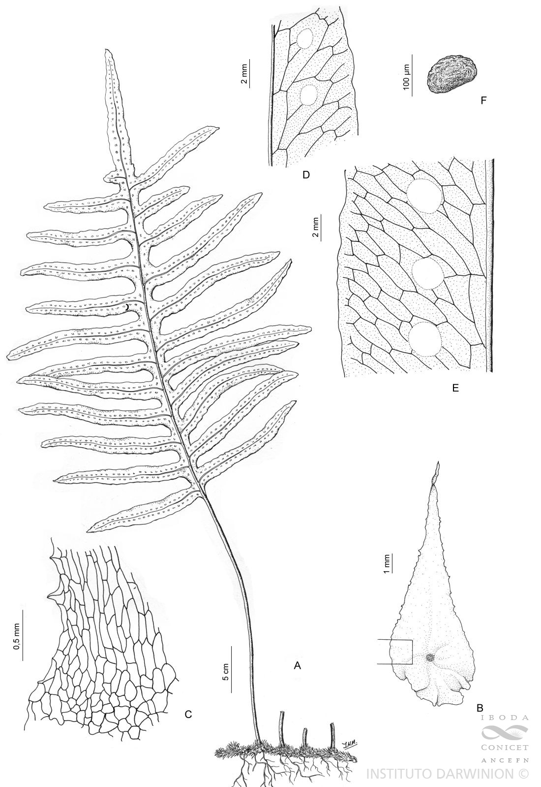A. Planta. B. Porción de la pinna con detalle de la nerviación y posición de los soros. C. Escama rizomática. D. Escama filopodial. E. Detalle de la porción basal de la escama rizomática..
