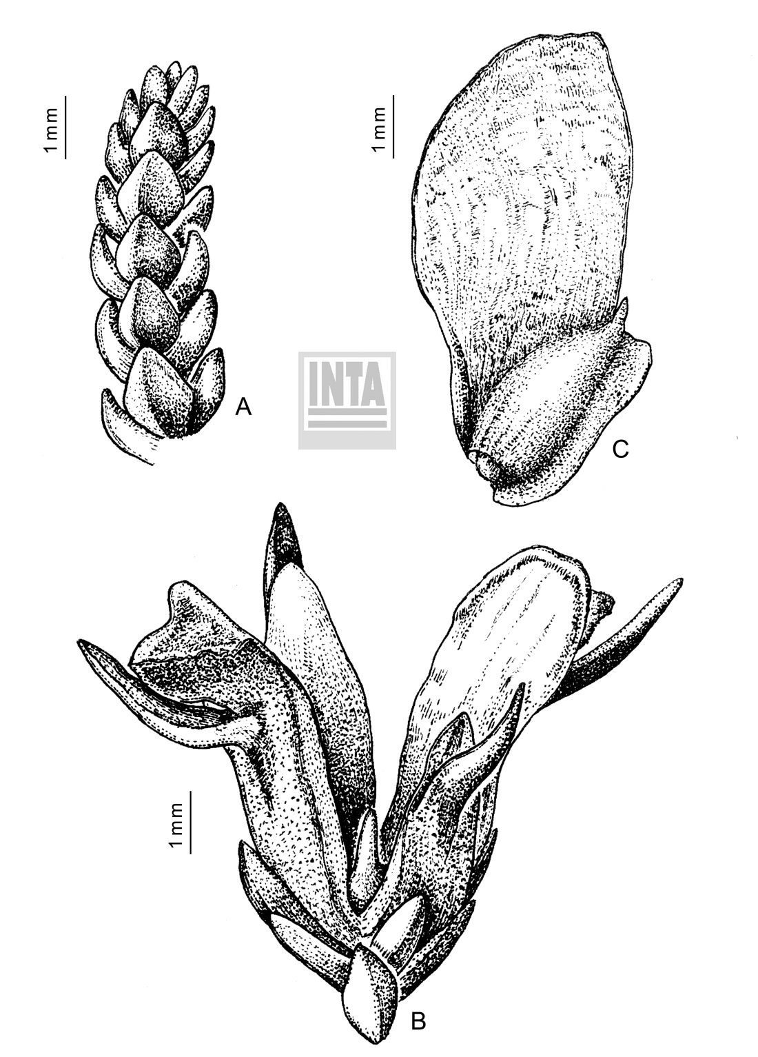 A. Cono masculino. B. Cono femenino abierto. C. Semilla.