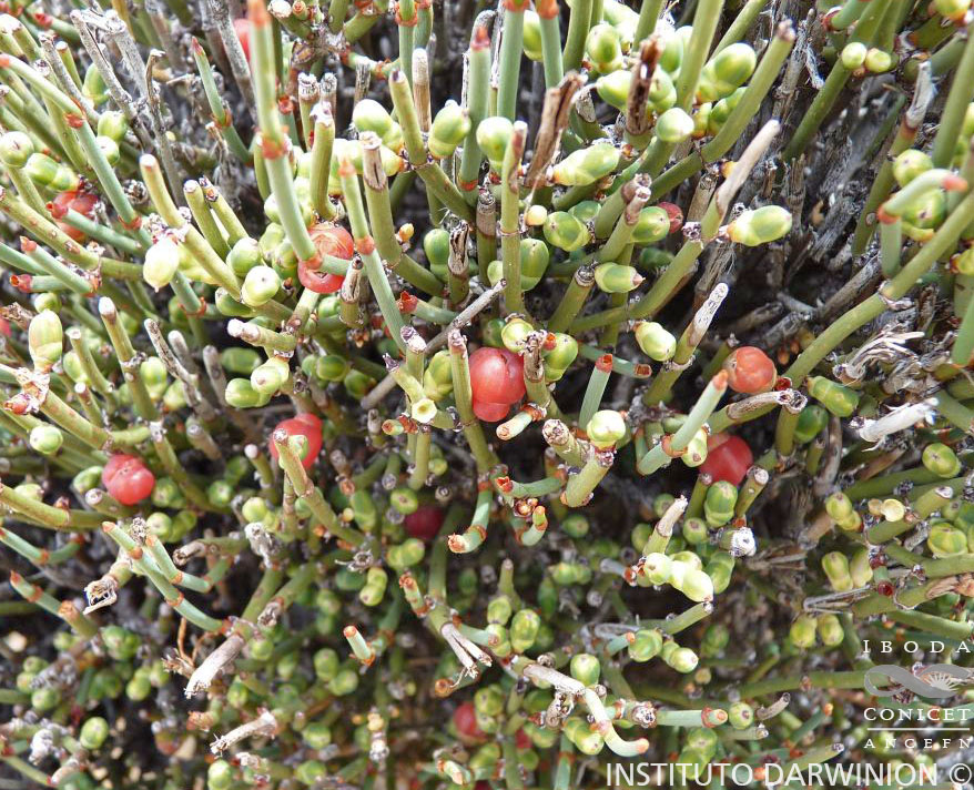 Arbustos decumbentes o erectos, hasta de 1,5 m de alto, o rastreros, rizomatosos, formando tapices cespitosos. Ramas maduras erectas, rastreras o decumbentes; ramitas jóvenes erguidas, de 0,5-2,5 mm de diámetro. Heterófilos, verticilos con hojas fusionadas por el tejido membranáceo y/o por el tejido fibroso del mesófilo, hojas con distinto grado de desarrollo de la base envainante y del apículo terminal sobre la misma planta. Hojas dispuestas en verticilos decusados (excepcionalmente pueden encontrarse ramas con verticilos foliares 3-meros); persistentes, verdosas, castañas cuando secas, con la parte central y basal de la vaina algo abultadas, escindidas a la madurez, recurvadas; base foliar envainante, vestigial o conspicua, formada por la fusión de mesófilo fibroso o membranáceo; tejido fibroso grueso central o abarcando todo el mesófilo; tejido membranáceo formando alas desde el extremo a la base del apículo o fusionado formando parte de la base envainante; apículos foliares vestigiales a acintados, con los márgenes involutos. Estróbilos microsporangiados axilares o terminales, sésiles o pedunculados, globosos u ovoides, de 4-8 mm de largo, con (1-2-)3-8(-10) verticilos de brácteas decusadas, soldadas entre sí hasta más o menos la mitad de su longitud; microsporofilos de 2,5-5 mm de largo; microsporangios 2-6, globosos, 2-3-loculares. Estróbilos megasporangiados de 3-10 mm de largo, con pedúnculo de 2-12(-30) mm de largo, con 3-5 verticilos de brácteas decusadas, soldadas entre sí hasta 1/3-1/2 de su longitud; cuando maduros los estróbilos se tornan carnosos, globosos, de 7-12 mm de diámetro, rojos, rosados o ebúrneos. Semillas 2, ovoides, con dorso convexo y cara ventral plana, castaño claras o castaño oscuras a negras, generalmente cubiertas por el par superior de brácteas del estróbilo.