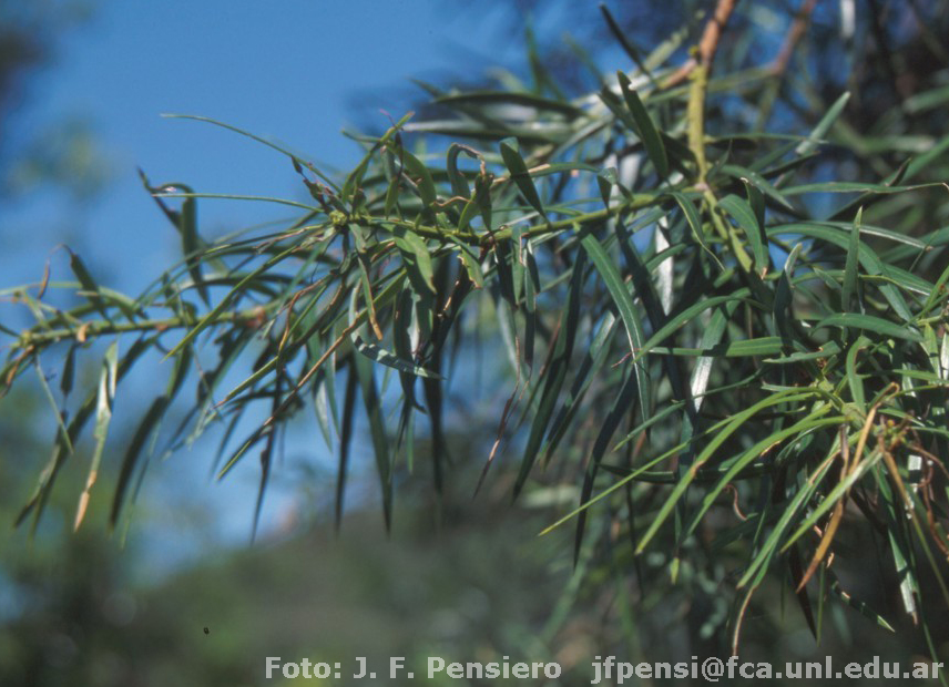 Árboles hasta de 20 m de alto y troncos de 1,5 m de diámetro, muy ramificados, con rámulos subverticilados, ascendentes. Hojas dispuestas helicoidalmente, subpecioladas, lineares, de 5- 12 cm × 2-4 mm, acuminadas, margen apenas revoluto, algo coriáceas, nervadura central deprimida en el epifilo, con 2 bandas estomáticas poco visibles en el hipofilo, los estomas dispuestos en líneas discontinuas. Conos masculinos 2-5-fasciculados en el ápice de pedúnculos axilares, cilíndricos o amentiformes, de 10 -15 mm de largo; microsporofilos triangulares, sacos polínicos 2, globosos. Conos femeninos en el ápice de un pedúnculo axilar de 5-20 mm de largo; macrosporofilos 2-3, generalmente 1- ovulados, concrescentes, formando un receptáculo carnoso de 3-6 mm de largo, rojizo. Semillas de aspecto drupáceo, ovoides, de 6-8 mm de largo, ligeramente apiculadas.