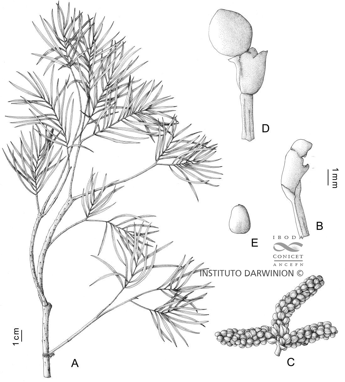 Árboles hasta de 20 m de alto y troncos de 1,5 m de diámetro, muy ramificados, con rámulos subverticilados, ascendentes. Hojas dispuestas helicoidalmente, subpecioladas, lineares, de 5- 12 cm × 2-4 mm, acuminadas, margen apenas revoluto, algo coriáceas, nervadura central deprimida en el epifilo, con 2 bandas estomáticas poco visibles en el hipofilo, los estomas dispuestos en líneas discontinuas. Conos masculinos 2-5-fasciculados en el ápice de pedúnculos axilares, cilíndricos o amentiformes, de 10 -15 mm de largo; microsporofilos triangulares, sacos polínicos 2, globosos. Conos femeninos en el ápice de un pedúnculo axilar de 5-20 mm de largo; macrosporofilos 2-3, generalmente 1- ovulados, concrescentes, formando un receptáculo carnoso de 3-6 mm de largo, rojizo. Semillas de aspecto drupáceo, ovoides, de 6-8 mm de largo, ligeramente apiculadas.