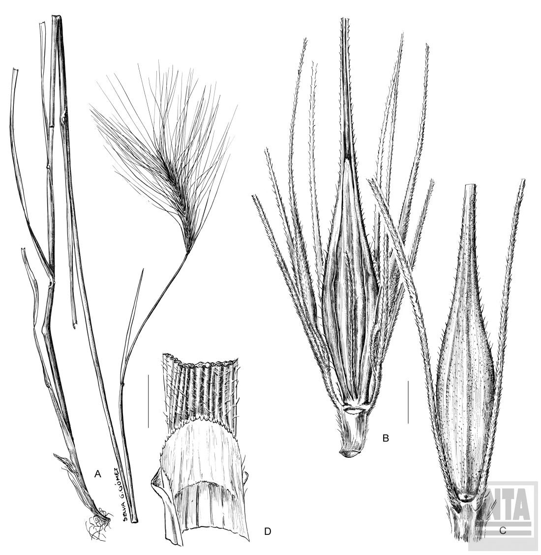 Plantas perennes, densamente cespitosas, con cañas de (10-)18- 55(-95) cm de alto, geniculadas a erectas; nudos glabros; lígulas de 0,5- 1 mm de largo, truncadas, con el ápice finamente ciliado; láminas de (15-)21-140 x 1-3,5 mm, planas o con los márgenes involutos, cortamente pubescentes a escabrosas; aurículas ausentes. Inflorescencia una espiga de (30-)50-75(-120) x 5-10 mm, rojiza a negruzca o verdosa, erecta o péndula, con aristas divergentes, deshaciéndose fácilmente al secarse; raquis frágil. Espiguilla central sésil; glumas de (23-)29-42(-47) x 0,2- 0,3 mm, setáceas, escabrosas, abiertas a la madurez; cuerpo de la lemma de 6,5-8,5(-10) mm de largo, escabroso, con aristas de 21-34(-41) mm de largo; lodículas de 1,5 mm de largo, lanceoladas, ciliadas; anteras de 1,5-2 mm de largo, amarillas; prolongación de la raquilla de (3-)4,8-7,8 mm de largo. Espiguillas laterales estériles o estaminadas, raro perfectas; pedicelos de 0,5-1,5 mm de largo; glumas de (20-)30-45 mm de largo, setáceas, aristiformes, escabrosas, abiertas a la madurez; lemmas, incluyendo la arista, de (6-)13-22 mm de largo, escabrosas.