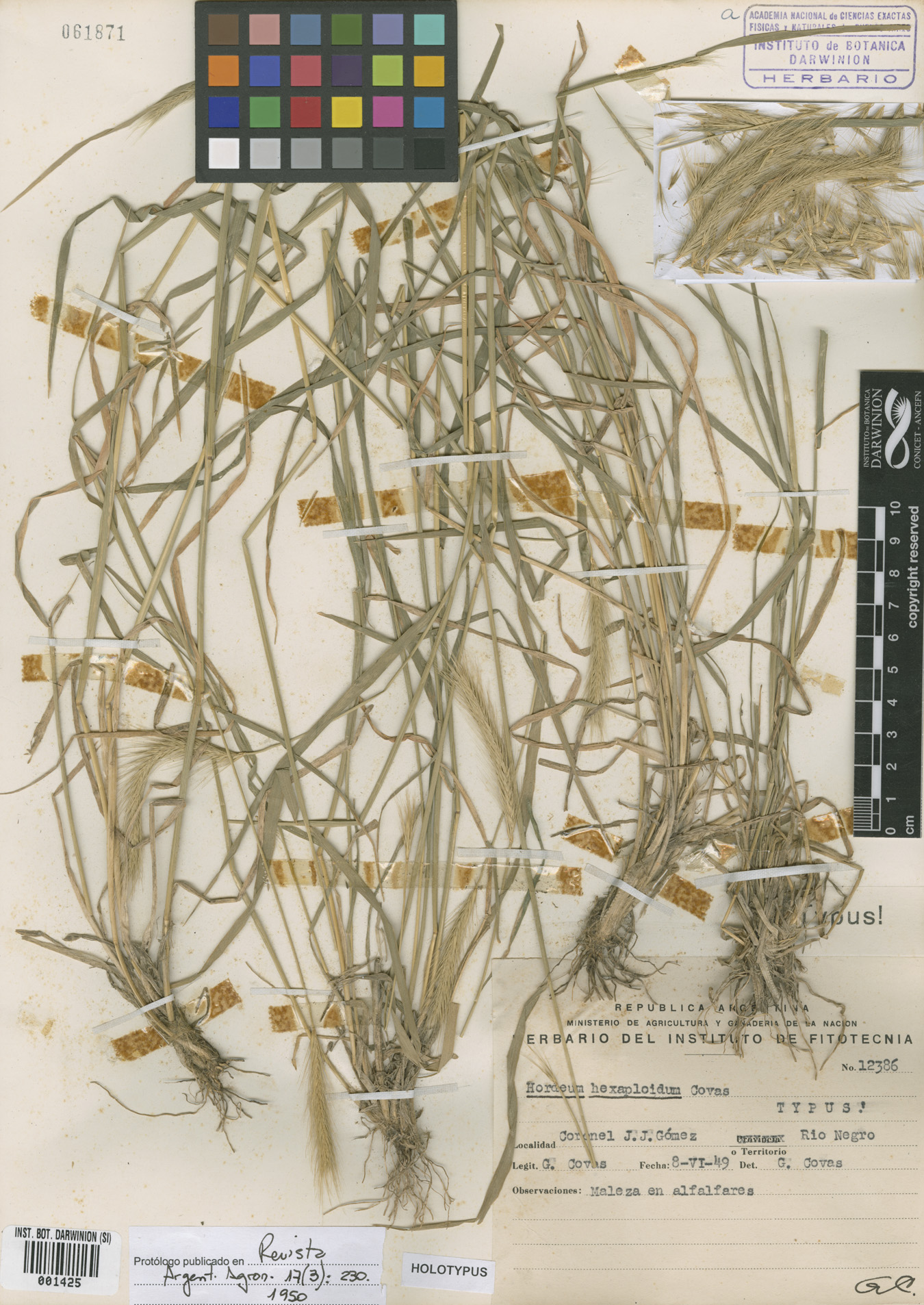 Plantas perennes, a menudo de vida corta, cespitosas, con cañas de 30-60(-75) cm de alto, rígidas, erectas, raro geniculadas; nudos glabros; lígulas de 0,6-1,6 mm de largo, truncadas, con borde dentado; láminas de 15-155 x 2-4 mm, planas a ocasionalmente involutas en los márgenes, escabrosas y con largos pelos entremezclados; glaucas; aurículas ausentes. Inflorescencia una espiga de (40-)60-95(-105) x 4-6 mm, exerta, pajiza a verdosa, en ocasiones madurando dentro de las hojas superiores. Espiguilla central sésil; glumas de (12,5-)15-20(-22) mm de largo, setáceas, abiertas a la madurez, pubescentes a escabrosas en la parte superior; cuerpo de la lemma de 6,5-7,5(-9,5) mm de largo, escabrosa, con arista de (-8)10-15(-18) mm de largo; pálea de 6,5-7 mm de largo, ralamente pilosa; lodículas de 0,8 mm de largo con ápice ciliado; anteras de 1,5-2 mm de largo, amarillas; prolongación de la raquilla de (2,7-)3,1- 4,5(-5,1) mm de largo. Espiguillas laterales rudimentarias, estériles u ocasionalmente estaminadas, pedicelos de 1-1,2 mm de largo; glumas de (12-)14,5-19,3(21) mm de largo, setáceas, abiertas a la madurez, pubescentes.