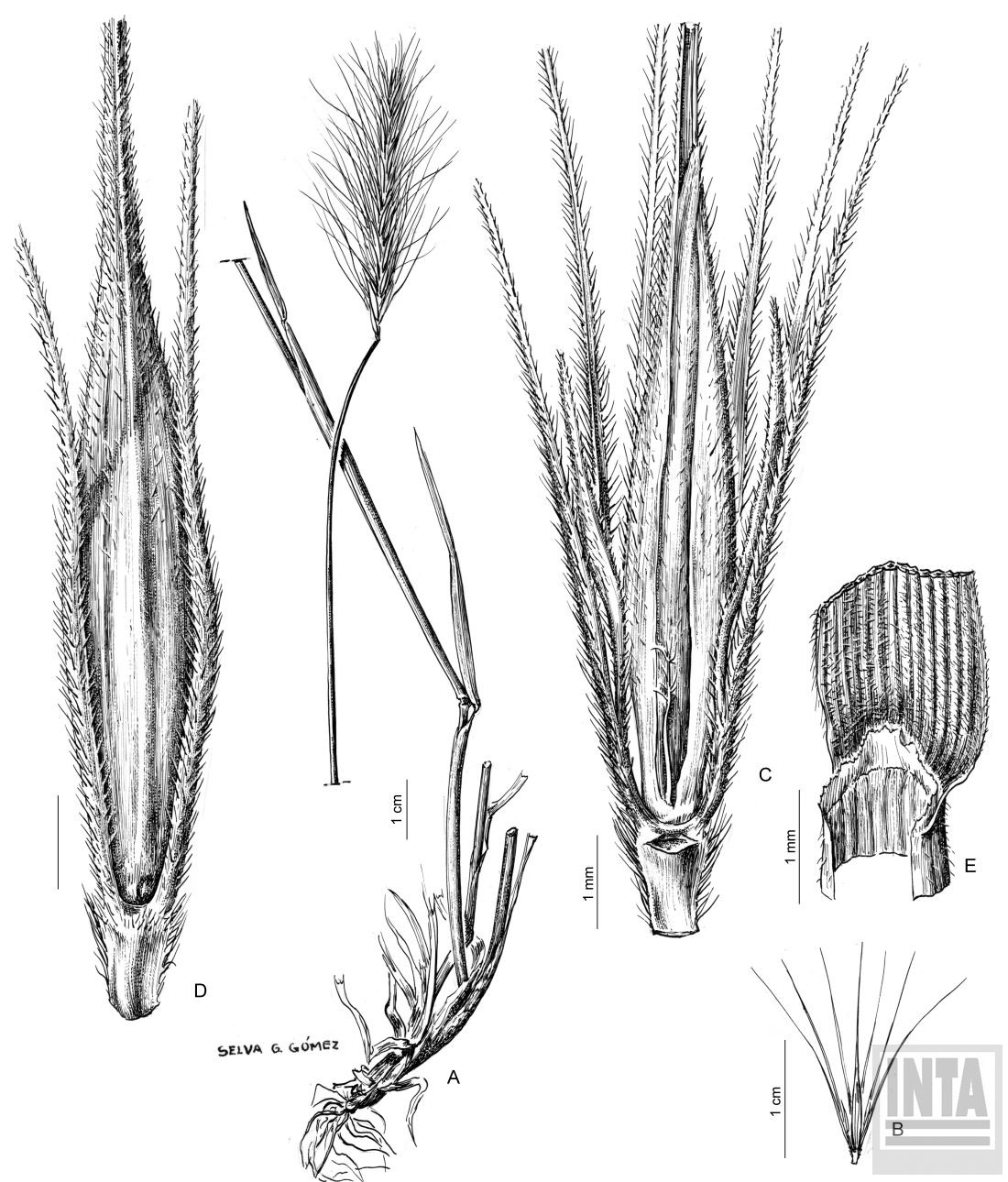 Plantas perennes, cespitosas, con cañas de (6-)17-44(-75) cm de alto, geniculadas a erectas; nudos glabros; lígulas hasta de 0,5 mm de largo, truncadas, con pelos largos en el ápice; láminas de 5-100 x 1-4 mm, involutas, a veces aplanadas, pubescentes a escabrosas; aurículas ausentes. Inflorescencia una espiga de (20-)30-55(-70) x 4-6 mm, rojiza a negruzca, comprimida lateralmente, erecta; raquis frágil. Espiguilla central sésil; glumas de 6,2-25 mm de largo, setácaes, escabrosas a pubescentes con pelos de 0,2-0,3 mm de largo, abiertas a la madurez; cuerpo de la lemma de 4,5-7,9 mm de largo, escabrosa, con arista de 3,4- 15,5(-17) mm de largo; pálea tan larga como la lemma, glabra algo pilosa en las carinas, ápice entero; lodículas de 0,5-0,8 mm de largo, lanceoladas, ciliadas; anteras de 1-1,5 mm de largo, amarillas; prolongación de la raquilla 1,5-4,5 mm de largo. Espiguillas laterales usualmente rudimentarias, estériles, raro estaminadas, pedicelos hasta de 1 mm de largo; glumas de 10-18 mm de largo, setáceas, escabrosas o pubescentes, abiertas a la madurez; lemmas, incluyendo las aristas, de 6-11 mm de largo, pubescentes.