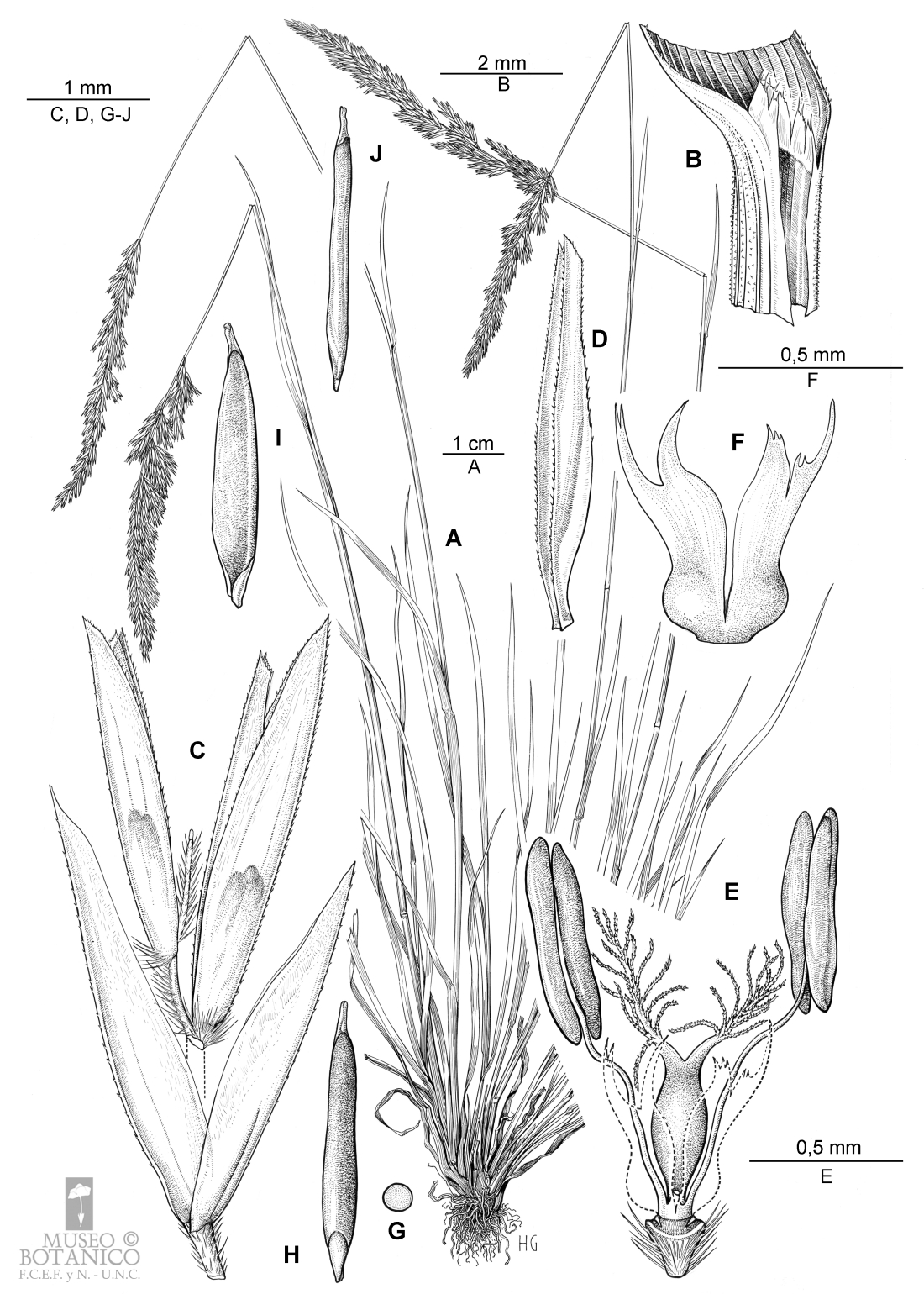Plantas perennes de (16-)30-60(-70) cm de alto, con rizomas breves estoloniformes, delgados, prefoliación convoluta; cañas simples, erectas, a veces geniculadas en la base, 2-nodes; nudos comprimidos, castaños o verdosos, glabros o pubescentes, el entrenudo inferior muy corto; hojas formando un césped largo de igual longitud que la caña florífera, ocasionalmente llega a la mitad de la misma; cañas floríferas escabriúsculas, pubérulas o pilosas, desde unos milímetros hasta ca. 3 cm por debajo de la inflorescencia, glabras hacia la base; vainas glabras o cubiertas de pelos largos, retrorsos; lígulas membranáceas, triangulares o truncadas, margen eroso-pestañoso, con el dorso glabro o pubescente, lígulas de las innovaciones estériles y las basales de las cañas floríferas de 0,5-1 mm de largo, las lígulas de las láminas superiores de la caña de (0,7-1-)2-2,5 mm de largo; láminas de (11-)20-23 cm x 2-3 mm, planas, seríceas o con la cara adaxial glabra y la abaxial muy pubescente, excepcionalmente glabras. Inflorescencias de (3,5-5-)6-10 cm x 7-15(-23) mm, subespiciformes, exertas de la vaina, cilíndricas, interrumpidas en la base, brillantes, ramificaciones laterales breves densamente espiculadas, raquis y pedicelos de las espiguillas pubérulos o pubescentes. Espiguillas de (4,5-) 5-5,5(-6-7) x 2-3 mm, 2-3-floras, de contorno ovado o más o menos flabeliforme, pajizas; glumas herbáceas, desiguales, glabras, carinadas, escabrosas en la mitad superior de la quilla, la inferior de (3,8-)4 mm de largo, linear-lanceolada, 1-nervia, siempre menor que el antecio contiguo, la superior de 4,5-5 mm de largo, lanceolada, 3-nervia, tan larga como el conjunto de antecios, poco menor que los mismos o excepcionalmente mayor; callo con pelitos escasos y cortos; raquilla poco pilosa, primer artejo de 0,6-0,7(-1) mm de largo, el segundo de 0,7-0,9(-1,2) mm; antecio inferior de 4-5 mm de largo, el superior de 3,5-4,5 mm; lemma 5-nervia, nervios laterales tenues desvanecidos hacia la ½ superior de la misma, ápice agudo, entero o apenas hendido, mútica, con un mucrón diminuto o excepcionalmente con una arístula subapical de aproximadamente 0,5 (-1-1,5) mm de largo que no alcanza el ápice de la lemma o apenas lo iguala; pálea membranácea, hialina, de menor longitud que la lemma correspondiente, excepcionalmente tan larga como ella, generalmente exerta, 2-aquillada, escabriúscula en las quillas, ápice 2-dentado, brevemente ciliado con surco dorsal profundo; lodículas 2, menores de 1 mm de largo, membranáceas, hialinas, sin rastros vasculares, angostas hacia la base y ensanchadas hacia la parte superior, borde superior glabro, dividido en dos lóbulos agudos, uno de ellos con lóbulo insinuado; estambres 3, anteras de (0,7-)1 mm de largo, excepcionalmente de 2,5-2,7 mm de largo, amarillas o violáceas; ovario obovoide, glabro, con estilos cortos, subterminales, estigmas plumosos, blancos, muy visibles, generalmente exertos del antecio; cariopsis de 2-3 mm de largo, elipsoidea, c