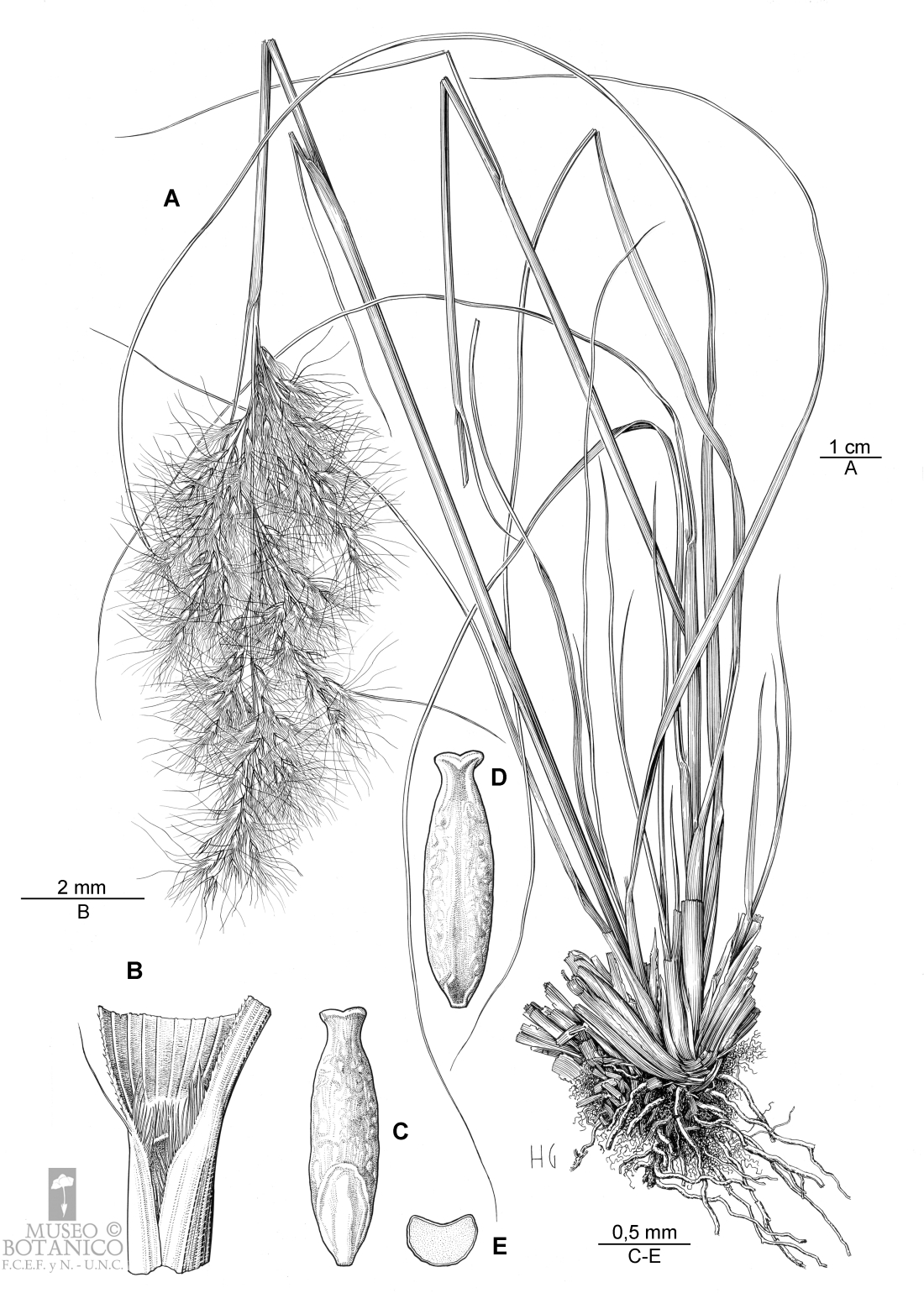 Lamprothyrsus hieronymi. A. Hábito. B. Lígula. C-E. Cariopsis, vista escutelar, hilar y transcorte respectivamente.