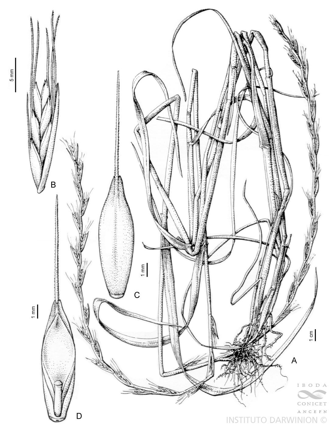 Plantas anuales, solitarias o formando matas de 30-110 cm de alto; cañas erectas, innovaciones nulas o escasas, 3-6 nodes, entrenudos de 3-14 cm de largo, cilíndricos a comprimidos; nudos castaño-oscuros, glabros; vainas de 5-20 cm de largo, lisas, glabras, los bordes membranáceos, aurículas estrechas en la base hasta de 1,5 mm de largo; lígulas membranáceas, truncadas, de 1-2 mm de largo; láminas lineares a linear-lanceoladas, de 6-25 cm x 3-10 mm, de prefoliación plana o convoluta, glabras, brillantes en la cara abaxial y escabriúsculas en la adaxial, ápice agudo, márgenes escabriúsculos. Inflorescencias compuestas por espigas comprimidas lateralmente, rectas, robustas, rígidas de 10-30 cm de largo, exertas; pedúnculos cilíndricos, estriados, glabros; raquis de 10-28 cm de largo, márgenes escabriúsculos, portando 8-28 espiguillas, éstas solitarias, en dos series, alternas, divergentes inmersas en excavaciones del raquis. Espiguillas 4-10 floras, de 12-25 x 3- 6 mm; gluma inferior lanceolada sólo presente en la espiguilla terminal, de 8-18 mm de largo, 9-nervia, ápice subagudo, mútico; gluma superior lanceolada, de 10-22 mm de largo, 7-9 nervia, generalmente más largas o iguales que las espiguillas, raramente un poco menores, ápice subagudo; antecios gruesos y turgentes; lemma elíptica a ovada, endurecida a la madurez, de 6-8 mm de largo, 5-7 nervia, de ápice obtuso membranáceo, sin arista ó con arista subapical, retorcida de 3-4 mm de largo o recta de hasta 20 mm de largo, escabriúscula en los márgenes; pálea elíptica, de menor a igual tamaño que la lemma, con las carinas cilioladas, ápice agudo-subagudo membranáceo; anteras de 2,5 mm de largo; cariopsis ovoide, gruesa, de 5 mm de largo, castaña, moderadamente adherida a la lemma y pálea.