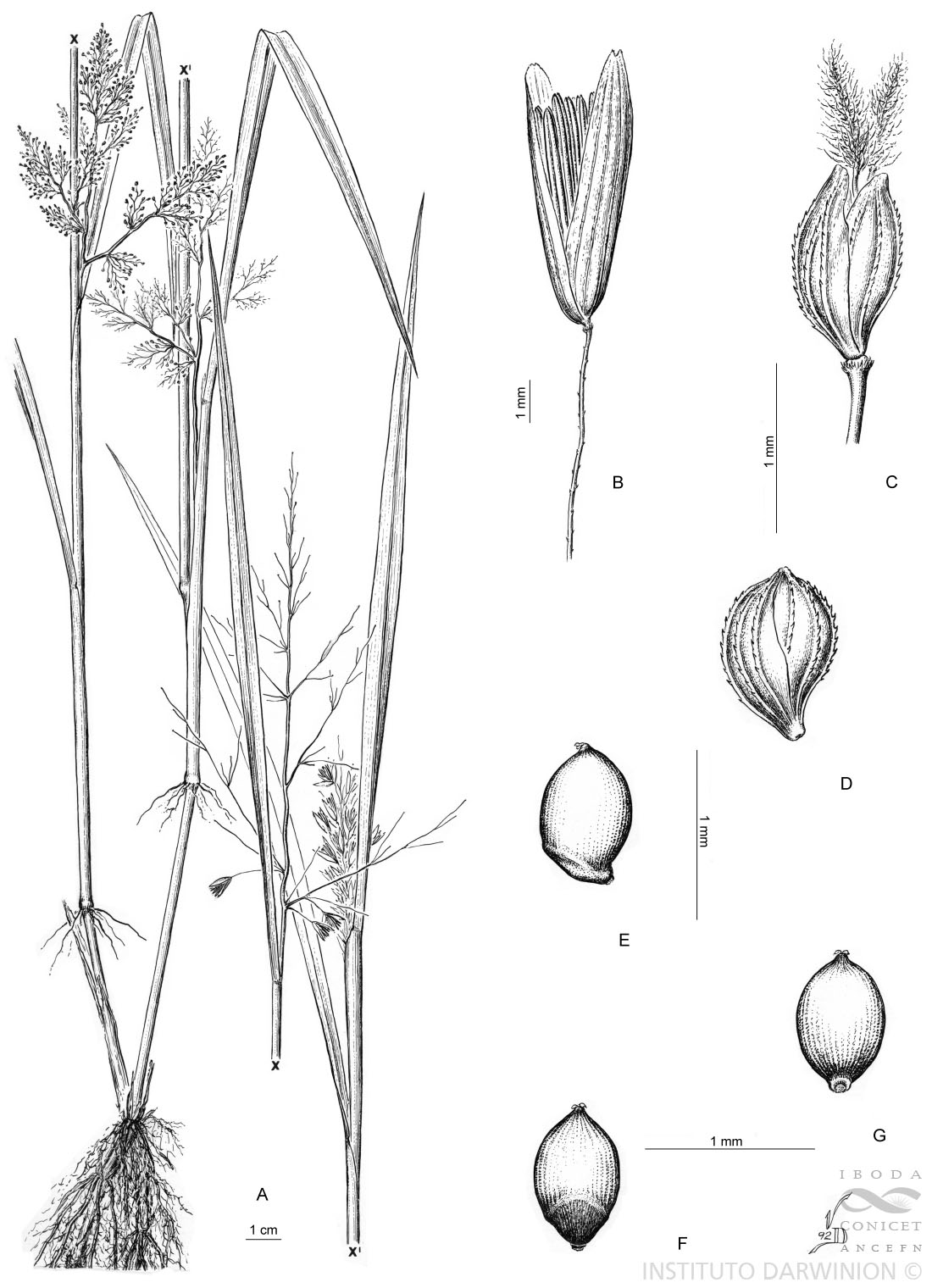 A. Planta. B. Espiguilla estaminada. C. Espiguilla pistilada, vista lateral. D. Espiguilla pistilada fructificada. E. Aquenio, vista lateral. F. Aquenio, vista escutelar. G. Aquenio, vista hilar.