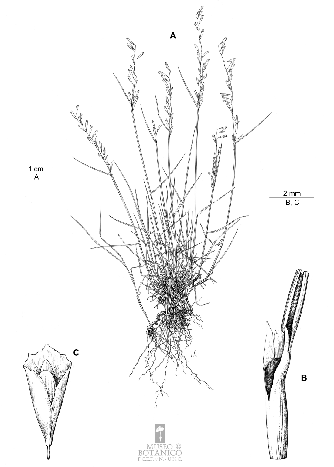 A, habito; B, lígula, C, espiguilla.