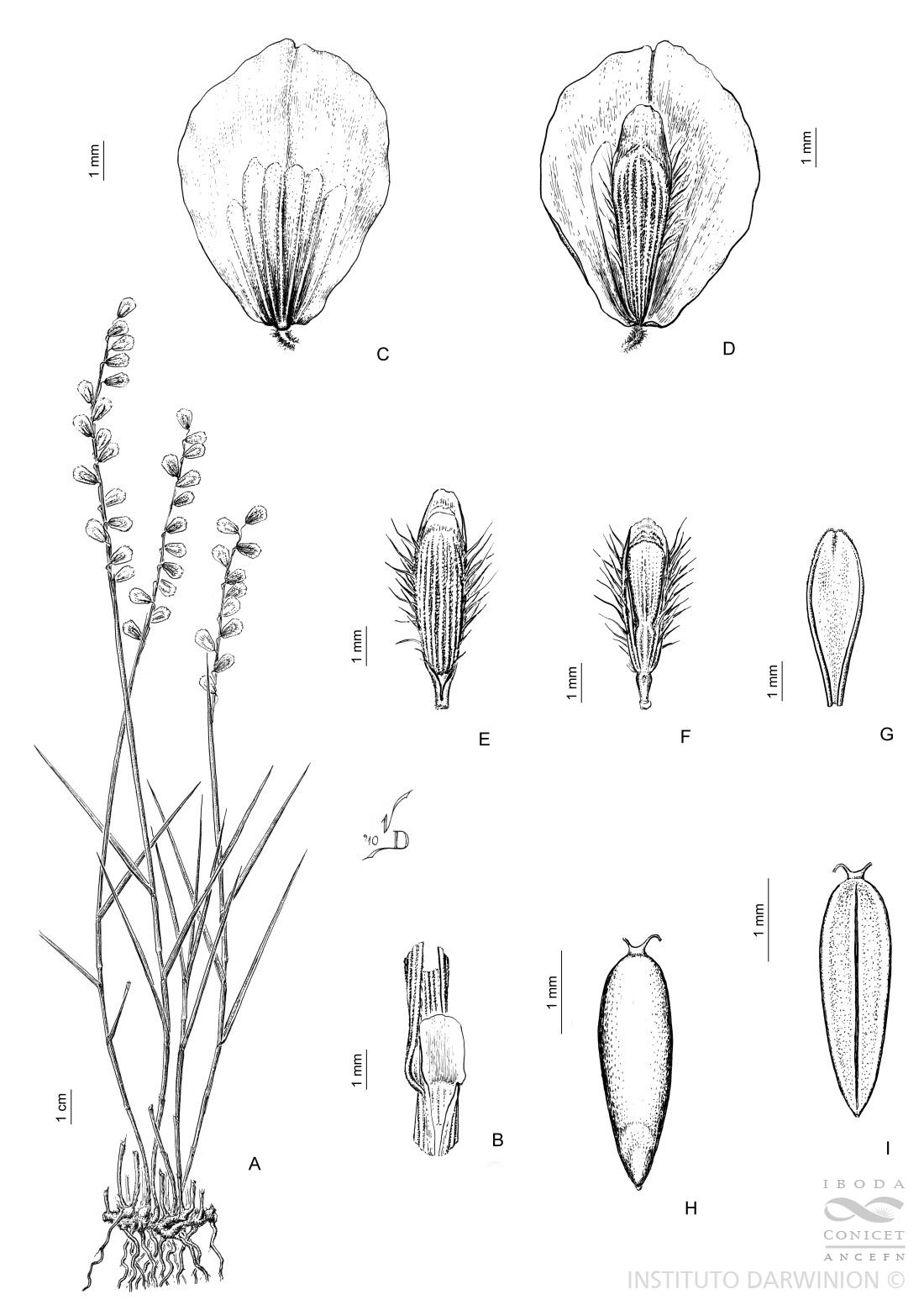 Plantas perennes, rizomatosas; cañas de 10-55 cm de alto, erectas, simples, con hojas mayormente basales; entrenudos cilindricos, huecos, glabros; nudos no comprimidos, escabriúsculos; vainas de 2-5 cm de largo, más largas que los entrenudos, estriadas, glabras; lígulas de 2-6 mm de largo, membranáceas, hialinas; láminas lineares, de 2-7 cm x 2-3 mm, convolutas, glabras, escabrosas en la cara adaxial, los márgenes lisos, cortamente ciliados. Inflorescencia una panoja angosta, de 3-13 cm de largo, cortamente exerta, pedúnculo cilíndrico, glabro; eje principal estriado, glabro, pulvínulos glabros, ramificaciones de primer orden alternas, ligeramente divergentes del eje principal, las basales de 3-6 cm de largo, eje de las ramificaciones liso, glabro; pedicelos filiformes, flexuosos, de 2-6 mm de largo. Espiguillas nutantes u horizontales, comprimidas dorsiventralmente, pajizas a violáceas, con 1, ocasionalmente 2, antecios inferiores perfectos y 2-3 antecios superiores neutros; glumas 2, desiguales, membranáceas hacia la porción inferior e hialinas hacia el ápice; gluma inferior obovada, de 8-11 mm de largo, 7-nervia, glabra, los nervios anastomosados; gluma superior angostamente elíptica, de 5,5-8 mm de largo, 5-nervia; raquilla cortamente pilosa; antecio inferior perfecto, angostamente elipsoide, de 5-7 x 1,5-2 mm; lemma hialina en la porción apical, papirácea en el resto de la superficie, 7-nervia, la cara adaxial escabrosa y pilosa, con pelos flexuosos de 1 mm de largo hacia los márgenes de la lemma; pálea angostamente obovada, de 4,5-6 x 1-1,3 mm, 2-nervia, los nervios cortamente ciliolados, cortamente escabrosa en el resto de la superficie; callo cortamente piloso; lodículas 2, truncadas, ca. 0,2-0,4 mm de largo; estambres 3, anteras de 1-1,9 mm de largo; cariopsis angostamente elipsoidea, 2,4-3,3 x 0.8-1,2 mm; hilo linear, embrión menos de ½ del largo de la cariopsis; antecio superior neutro, ocasionalmente perfecto, con lemma escabrosa de 2,9-3,8 mm de largo, esparcidamente pilosa hacia la base; pálea ausente, presente en los antecios perfectos; cuerpo apical obovoide, reducido a las lemmas rudimentarias, páleas ausentes o vestigiales.