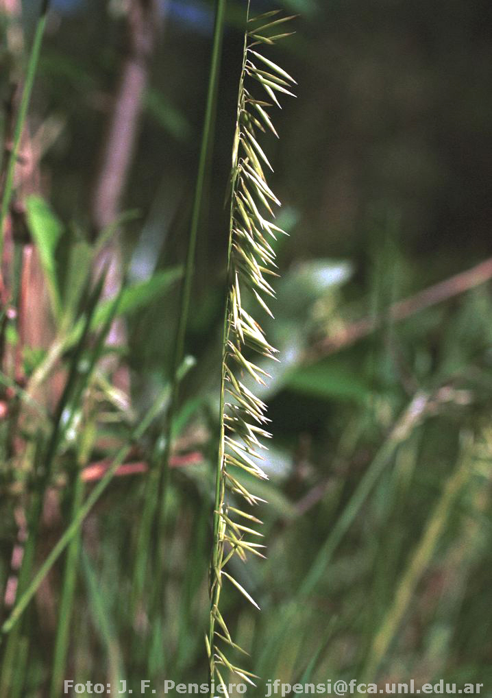 Plantas perennes, densamente cespitosas, con rizomas breves; cañas erectas, de 20-100 cm de alto, simples, escabriúsculas; entrenudos cilíndricos, glabros; nudos glabros, castaños; vainas usualmente más largas que los entrenudos, enteras, hendidas a la madurez, carenadas, retrorso-escabrosas; lígulas reducidas, ca. 0,3 mm de largo, membranáceas, en ocasiones ausentes; región ligular cortamente pilosa; láminas lineares, de 5-25 cm x 2-3 mm, planas a convolutas, rígidas, de ápice atenuado y ápice acuminado, punzantes, escabríúsculas, glabras, los márgenes escabrosos. Inflorescencia una panoja contraida de 5-20 x 1-2 cm, exerta, con pedúnculo de 10-30 cm de largo, cilíndrico, retrorso escabroso; eje principal estriado, retrorso-escabroso, pulvínulos glabros; ramificaciones de primer orden cortas, llevando unas pocas espiguillas, adpresas, eje de las ramificaciones escabriúsculo; pedicelos flexuosos, cortamente pilosos, filiformes. Espiguillas comprimidas lateralmente, horizontales o péndulas en relación al eje principal, pajizas, llevando 2-3 antecios inferiores perfectos y 2 a 4 superiores neutros; glumas subiguales, de menor longitud que la espiguilla, membranáceas, con los márgenes hialinos, glabras; gluma inferior navicular, de 8,5-9 x 4-4,5 mm, 5-nervia; gluma superior similar a la gluma inferior, 5-nervia; raquilla cortamente pilosa; antecio inferior lanceolado, de 7,8-9,4 x 1,6-2,2 mm perfecto, castaño; lemma con la cara abaxial escabriúscula, cara abaxial lisa, lustrosa; pálea de 4,6-5,1 x 1,2-1,5 mm, membranácea, 2-nervia, con los márgenes cortamente ciliados; callo cortamente piloso; lodículas 2, truncadas, ca. 0,2 mm de largo; estambres 3, anteras de 1,6-2,1 mm de largo; cariopsis anchamente elipsoidea, de 1,9-2,4 x 0,7-0,9 mm; hilo linear; embrión ½ o menos del largo de la cariopsis; segundo y tercer antecio perfectos, similares al primero pero menores; cuerpo apical subfusiforme, formado por los antecios neutros.