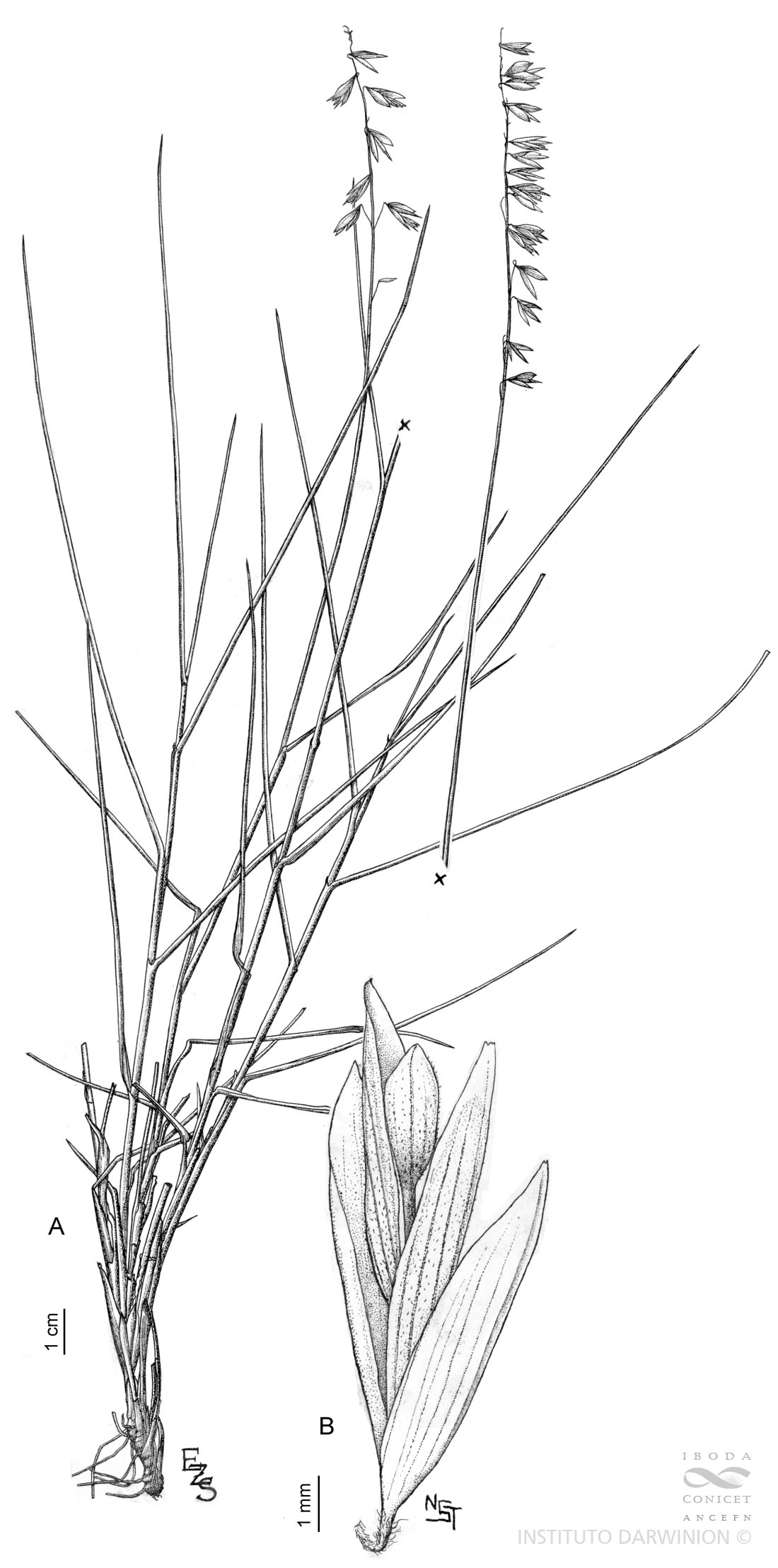 Plantas perennes, densamente cespitosas, con rizomas breves; cañas erectas, de 20-100 cm de alto, simples, escabriúsculas; entrenudos cilíndricos, glabros; nudos glabros, castaños; vainas usualmente más largas que los entrenudos, enteras, hendidas a la madurez, carenadas, retrorso-escabrosas; lígulas reducidas, ca. 0,3 mm de largo, membranáceas, en ocasiones ausentes; región ligular cortamente pilosa; láminas lineares, de 5-25 cm x 2-3 mm, planas a convolutas, rígidas, de ápice atenuado y ápice acuminado, punzantes, escabríúsculas, glabras, los márgenes escabrosos. Inflorescencia una panoja contraida de 5-20 x 1-2 cm, exerta, con pedúnculo de 10-30 cm de largo, cilíndrico, retrorso escabroso; eje principal estriado, retrorso-escabroso, pulvínulos glabros; ramificaciones de primer orden cortas, llevando unas pocas espiguillas, adpresas, eje de las ramificaciones escabriúsculo; pedicelos flexuosos, cortamente pilosos, filiformes. Espiguillas comprimidas lateralmente, horizontales o péndulas en relación al eje principal, pajizas, llevando 2-3 antecios inferiores perfectos y 2 a 4 superiores neutros; glumas subiguales, de menor longitud que la espiguilla, membranáceas, con los márgenes hialinos, glabras; gluma inferior navicular, de 8,5-9 x 4-4,5 mm, 5-nervia; gluma superior similar a la gluma inferior, 5-nervia; raquilla cortamente pilosa; antecio inferior lanceolado, de 7,8-9,4 x 1,6-2,2 mm perfecto, castaño; lemma con la cara abaxial escabriúscula, cara abaxial lisa, lustrosa; pálea de 4,6-5,1 x 1,2-1,5 mm, membranácea, 2-nervia, con los márgenes cortamente ciliados; callo cortamente piloso; lodículas 2, truncadas, ca. 0,2 mm de largo; estambres 3, anteras de 1,6-2,1 mm de largo; cariopsis anchamente elipsoidea, de 1,9-2,4 x 0,7-0,9 mm; hilo linear; embrión ½ o menos del largo de la cariopsis; segundo y tercer antecio perfectos, similares al primero pero menores; cuerpo apical subfusiforme, formado por los antecios neutros.