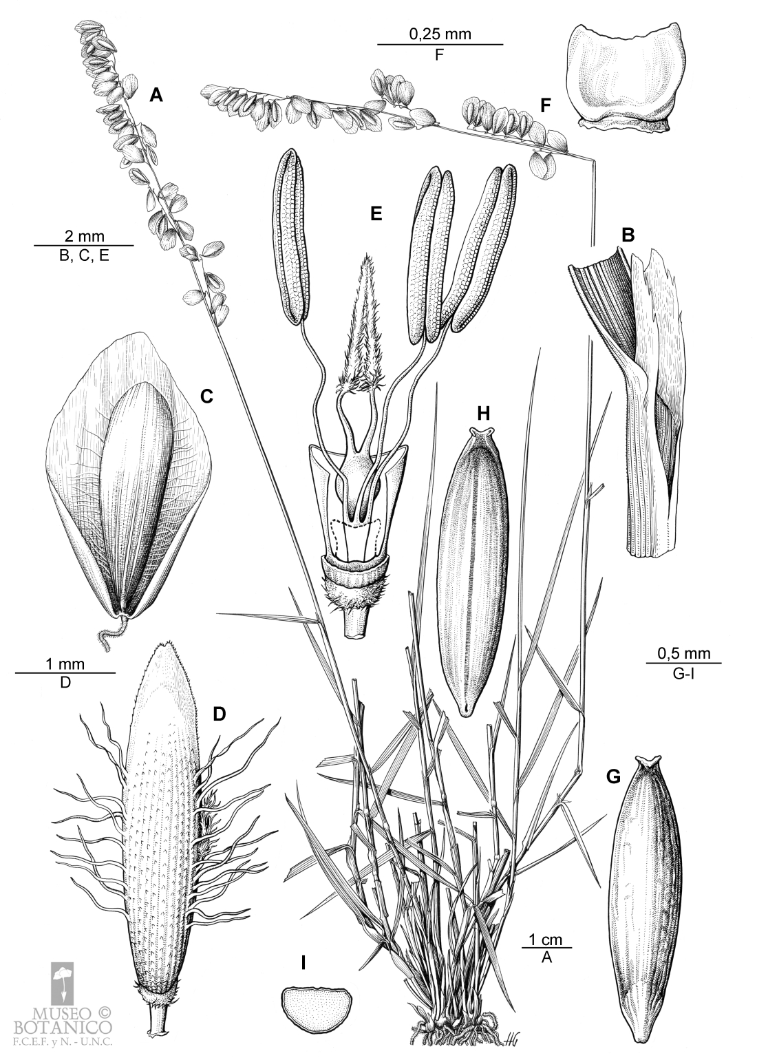 A. Hábito. B. Lígula. C. Espiguilla vista desde la gluma superior; la gluma inferior, hacia atrás, los pelos que aparecen entre ambos pertenecen a la lemma. D. Antecio fértil visto desde la lemma. E. Flor perfecta con lodículas soldadas; hacia atrás, parte inferior de la pálea. F. Lodículas soldadas formando una pieza única. G-I. Cariopsis, vista escutelar, hilar y transcorte respectivamente