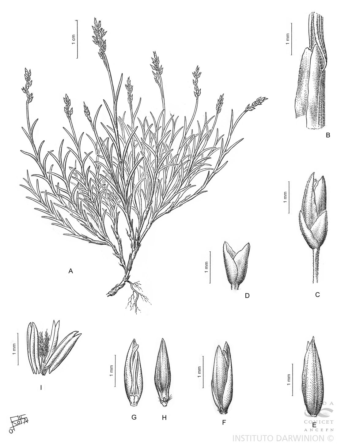 Plantas diminutas, perennes, rizomatosas, constituyendo matas densas, de 2-8(-11) cm de alto, las raíces y los rizomas generalmente de 1-2(-2,5) mm de ancho; cañas diminutas, de 0,3-0,5 mm de diámetro, inconspicuas, inmersas en el follaje; hojas principalmente caulinares, follaje denso; vainas glabras a finamente papilosas, estriadas; lígulas redondeadas, ligeramente erosas, ca. 1,5 mm de largo; láminas involutas y arquedas, erectas a ascendentes, abaxial y adaxialmente surcadas y papilosas, de 2-8 x 0,8-1 mm, ápice navicular. Inflorescencia una panoja diminuta, grácil, erecta, de 1-2 cm x 1-5 mm, pauciflora, 1-3 espiguillas por panoja, raramente hasta 5, generalmente incluidas en el follaje, ramificaciones muy cortas, de 5-9 mm de largo, papilosas, con sólo una espiguilla. Espiguillas negruzcas, de 2,9-3,1 mm de largo; gluma inferior ca. 1 mm de largo, ovada, 1-nervia, ligeramente papilosa, ápice agudo; gluma superior de 1,2-1,3 mm de largo, oblongo-ovada, 1-nervia, levemente papilosa, ápice agudo; lemma 3-nervia, negruzca, brillante, glabra, de 2,9-3,1 mm de largo, terminando en una diminuto mucrón curvo; pálea 2-nervia, negruzca, brillante, glabra, de 2,5-2,7 mm de largo; anteras de 1,3-1,5 mm de largo; cariopsis fusiforme, castaña clara, de 2-2,5 mm de largo.