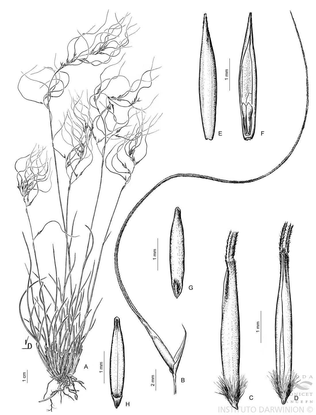 A, planta; B, espiguilla; C, antecio visto de lado; D, antecio visto por la pálea; E, pálea vista dorsal; F, pálea y lodículas; G, cariopse vista dorsal; H, vista ventral.