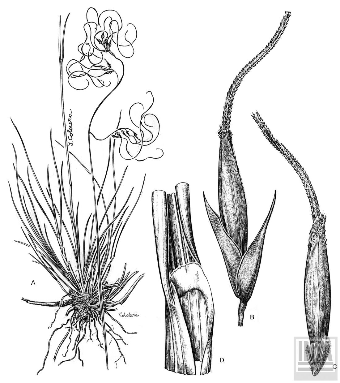 Plantas perennes, densamente cespitosas, de 12-45 cm de alto; cañas cilíndricas, de 0,5-1 mm de diámetro, erguidas, rectas, simples, paucinodes; nudos conspicuos, comprimidos, castaños, glabros; entrenudos longitudinalmente estriados, glabros; vainas foliares estriadas, menores o iguales a los entrenudos, glabras, con márgenes hialinos, glabros; lígulas truncadas, de 0,5-1,5 mm de largo, membranáceas, con margen entero, glabras; láminas lineares, convolutas, de 3,5-7,5 cm x 0,5-4 mm, rectas o algo flexuosas, epifilo notablemente estriado, pubérulo, hipofilo estriado, glabro, con márgenes escabriúsculos. Inflorescencia pauciflora, extendida, exerta, de 6-9 cm de largo. Espiguillas fusiformes, ca. 5 mm de largo; glumas subiguales, de 2,8-4,2 mm de largo, ambas menores que el antecio, agudas, gluma superior a veces 2-dentada en el ápice, membranáceas, glabras, 1-nervias, violáceas, con el ápice y los márgenes hialinos; lemma cilíndrica, con ligera compresión lateral, de 3,5- 5 x 0,6-0,7 mm, lisa, membranácea, violácea, glabra, hispídula en el ? apical del nervio medio, con márgenes abiertos hacia el ápice y 2 apéndices dentiformes apicales de 0,2-0,3 mm de largo; corona inconspicua, continua con el cuerpo de la lemma; arista flexuosa, subcircinada, de 2,5-5,2 cm de largo, con 3 canalículos, escabriúscula en toda su extensión, robusta, persistente, no articulada con la lemma; antopodio subagudo, de 0,1-0,5 mm de largo, densamente viloso; pálea aguda, de igual longitud y consistencia que la lemma, 2-nervia, con pelos en el dorso; lodículas 3, obtusas, enervias; cariopsis fusiforme, ca. 3 mm de largo; hilo linear subigual al largo de la cariopsis.