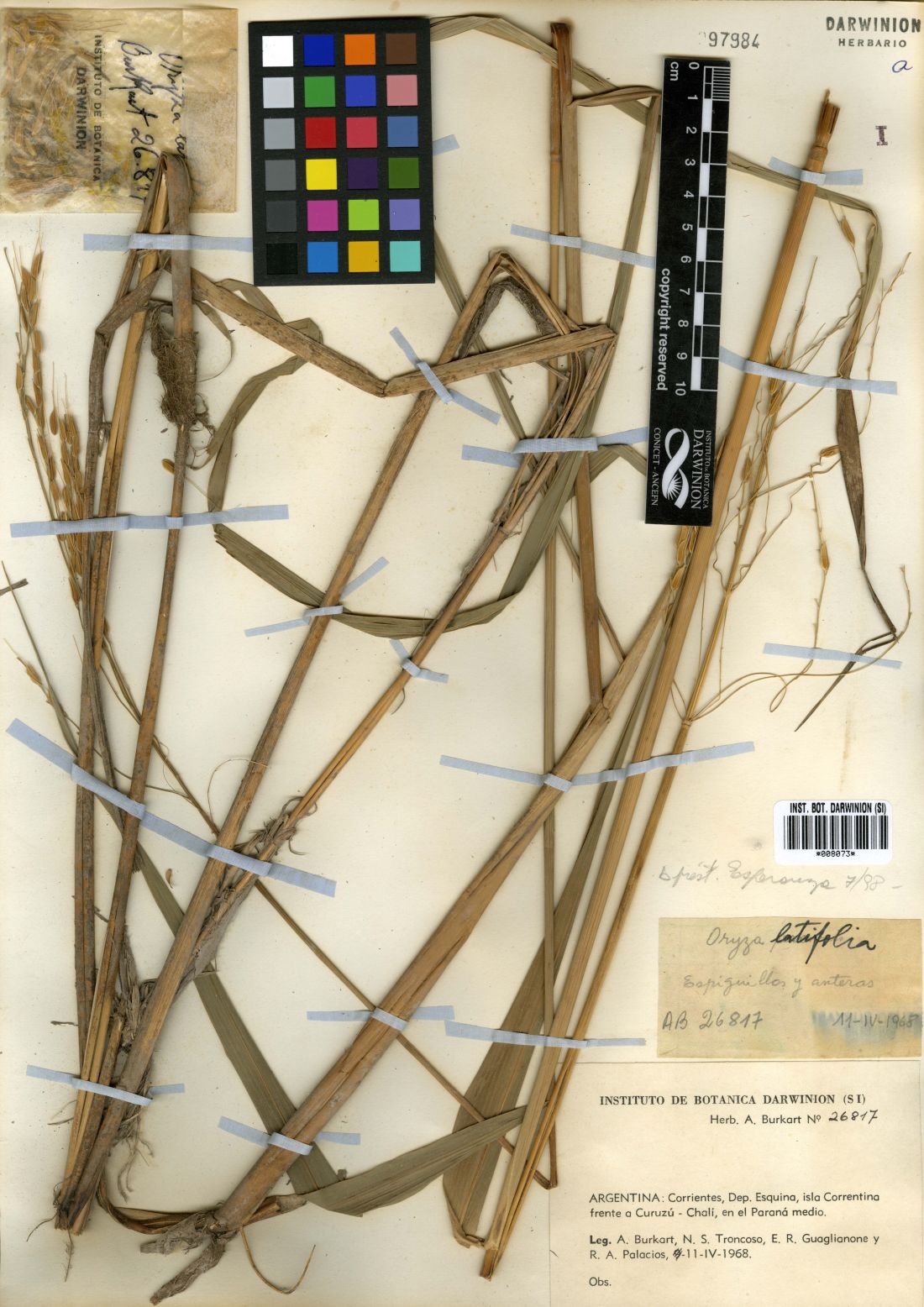 Plantas perennes, rizomas breves, muy arraigados; cañas huecas, decumbentes, enraizadas en los nudos inferiores, de 1 a 3 m de altura, 8-10 mm de ancho en la parte inferior; nudos glabros; vainas glabras o pestañosas en los márgenes, mayores o menores que los internodios, las inferiores áfilas, terminadas en 2 apéndices auriculiformes que se ciñen a las cañas; lígula membranácea de 1-7 mm de largo; láminas planas, oblongo-lanceoladas, de 25-70 x 1,8-4 cm, glabras o poco escabrosas en ambas superficies, los bordes brevemente involutos. Panícula piramidal amplia, de 25-50 cm de largo, ramas inferiores, en número de 4-8, verticiladas, de 14-25 cm de largo, las superiores alternas, menores, desnudas en su mitad inferior y divergentes durante la antesis; nudo inferior piloso. Espiguillas muy caedizas, de (4-)4,5-6,5(-7) mm de largo, verdosas o ferrugíneas, sostenidas por un pedicelo claviforme, persistente sobre las ramas, de 1-6 cm de largo, en general menor que el largo de la espiguilla, glabro o ralamente piloso; glumas lineares, agudas, glabras, de 2-2,5 mm de largo; lemma muy comprimida lateralmente, granuloso-estriada, con pestañas rígidas sobre los nervios, dorso hispídulo, aristada, arista apical escabrosa de 3-5 mm de largo; pálea aquillada, poco menor que su lemma y de igual textura, ápice mucronulado algo recurvo; estambres 6, anteras de 3,5-4 mm de largo; cariopsis oblonga, comprimida, con 2 surcos longitudinales conspicuos; mácula embrional de 1,5 mm de largo, pericarpio blanquecino u ocráceo, finamente estriado.