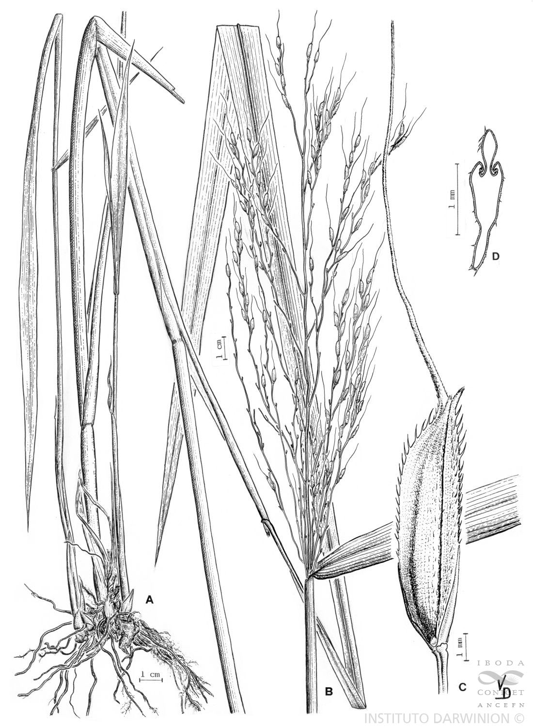 A. Planta. B. Inflorescencia. C. Espiguilla, vista lateral. D. Corte transversal del antecio.