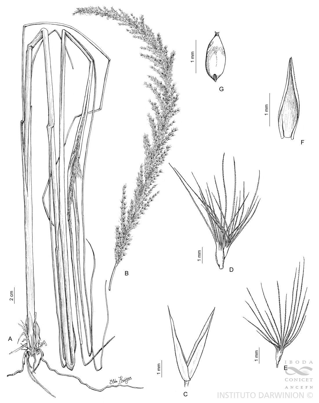A, planta; B, inflorescencia; C, glumas; D, conjunto de antecios; E, segundo antecio; F, pálea del primer antecio; G, cariopse vista cara hilar.