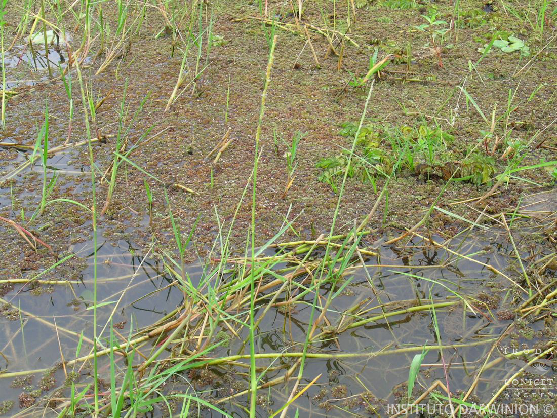 Plantas palustres, perennes, con rizomas profundos y largos estolones, innovaciones intravaginales; cañas decumbentes, hasta de 1,5 m de largo, ramificadas y arraigadas en los nudos inferiores, entrenudos cilíndricos, huecos, esponjosos, glabros; nudos glabros; vainas glabras, generalmente más largas que los entrenudos, márgenes glabros; lígulas membranáceo-ciliadas, de 0,5-0,7 mm de largo; láminas lineares de 5-30 cm x 3-12 mm, involutas, glabras, subcordadas en la base y agudas en el ápice, márgenes membranáceos, escabriúsculos. Inflorescencia en panoja contraída, terminal o axilar, de 5-30 x 1-1,5 cm, raquis plano-anguloso, glabro, con 6-15 racimos espiciformes glabros, alternos, ascendentes, adpresos o divergentes al eje principal, de 1-4 cm x 5-9 mm, terminado en una prolongación estéril. Espiguillas cortamente pediceladas, solitarias, unilaterales, dispuestas alternamente en dos series sobre los lados del raquis, elipsoides u ovoides, de 2,5-3(-3,2) x 0,8-1(-1,2) mm, glabras, con los nervios conspicuos; gluma inferior 1/5-? del largo de la espiguilla, membranosa, glabra, de ápice truncado, sin nervios o 1-nervia; gluma superior ½ del largo de la espiguilla, membranosa, de ápice obtuso, 5-nervia; lemma inferior tan larga como la espiguilla, membranosa, (3-)5-nervia; pálea inferior tan larga como el antecio, membranácea, hialina, glabra; flor inferior estaminada; antecio superior ovoide, 2,5-3 x 0,8-1(-1,2) mm, plano convexo, endurecido, transversalmente rugoso, ápice cortamente apiculado; lodículas 2, cuneiformes, estambres 3, anteras de 1-1,8 mm de largo; cariopsis elipsoide, escudete alcanzando ½ de su largo, hilo punctiforme.