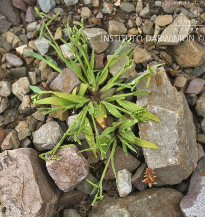 Plantas anuales, cespitosas, arrosetadas; cañas paucinodes de 1-8(-15) cm de alto, densamente ramificadas en los nudos inferiores; entrenudos de 5-15 mm de largo, teretes, híspidos; nudos castaños, glabros; vainas de 8-30 mm de largo, densa a esparcidamente pilosas, los márgenes ciliados; lígulas de 0,6-1 mm de largo, hialinas, con la cara abaxial cortamente pilosa; láminas linear-lanceoladas, de 1-5,5 cm x 1,5-4 mm, no pseudopecioladas, de base redondeada y ápice agudo, híspidas a esparcidamente pilosas, los márgenes ciliados. Inflorescencias subexertas, de 1,5-3 x 1-2 cm; pedúnculos hasta de 5 cm de largo, cilíndricos, glabros; eje principal aplanado, surcado, con pelos hacia los bordes o glabro; pulvínulos cortamente pilosos; ramificaciones 2-6, alternas; raquis de las ramificaciones de 0,4-1,5(-2) cm x 0,4-2 mm, de ápice agudo y terminando en una prolongación estéril, la cara adaxial glabra a pubescente, el nervio medio en zig-zag, la cara abaxial cortamente pilosa, con el nervio medio aplanado y piloso, los márgenes glabros o ciliados; pedicelos de 0,3-0,8 mm de largo, aplanados. Espiguillas ovoides a elipsoides, de 1,5-2,1 x 0,7-1,2 mm, biseriadas, glabras, de ápice agudo, cerradas a la madurez, verde-pálido; gluma inferior ausente; gluma superior y lemma inferior subiguales, tan largas como la espiguilla, lisas, glabras, 3-nervias; gluma superior cubriendo con los bordes a la lemma inferior; lemma inferior de dorso plano; pálea inferior y flor inferior ausentes; antecio superior elipsoide, de 1,4-1,9 x 0,6-0,9 mm, crustáceo, pajizo, no caedizo; lemma y pálea con papilas simples en toda la superficie, con cuerpos de sílice exfoliados hacia el ápice de la lemma; estambres 3, anteras de 1,1 mm de largo; lodículas 2, de 0,2 mm de largo; cariopsis de 1,2 x 0,7 mm, pajiza; hilo punctiforme; embrión ? del largo de la cariopsis.