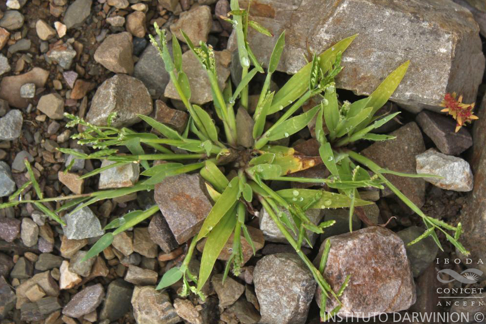 Plantas anuales, cespitosas, arrosetadas; cañas paucinodes de 1-8(-15) cm de alto, densamente ramificadas en los nudos inferiores; entrenudos de 5-15 mm de largo, teretes, híspidos; nudos castaños, glabros; vainas de 8-30 mm de largo, densa a esparcidamente pilosas, los márgenes ciliados; lígulas de 0,6-1 mm de largo, hialinas, con la cara abaxial cortamente pilosa; láminas linear-lanceoladas, de 1-5,5 cm x 1,5-4 mm, no pseudopecioladas, de base redondeada y ápice agudo, híspidas a esparcidamente pilosas, los márgenes ciliados. Inflorescencias subexertas, de 1,5-3 x 1-2 cm; pedúnculos hasta de 5 cm de largo, cilíndricos, glabros; eje principal aplanado, surcado, con pelos hacia los bordes o glabro; pulvínulos cortamente pilosos; ramificaciones 2-6, alternas; raquis de las ramificaciones de 0,4-1,5(-2) cm x 0,4-2 mm, de ápice agudo y terminando en una prolongación estéril, la cara adaxial glabra a pubescente, el nervio medio en zig-zag, la cara abaxial cortamente pilosa, con el nervio medio aplanado y piloso, los márgenes glabros o ciliados; pedicelos de 0,3-0,8 mm de largo, aplanados. Espiguillas ovoides a elipsoides, de 1,5-2,1 x 0,7-1,2 mm, biseriadas, glabras, de ápice agudo, cerradas a la madurez, verde-pálido; gluma inferior ausente; gluma superior y lemma inferior subiguales, tan largas como la espiguilla, lisas, glabras, 3-nervias; gluma superior cubriendo con los bordes a la lemma inferior; lemma inferior de dorso plano; pálea inferior y flor inferior ausentes; antecio superior elipsoide, de 1,4-1,9 x 0,6-0,9 mm, crustáceo, pajizo, no caedizo; lemma y pálea con papilas simples en toda la superficie, con cuerpos de sílice exfoliados hacia el ápice de la lemma; estambres 3, anteras de 1,1 mm de largo; lodículas 2, de 0,2 mm de largo; cariopsis de 1,2 x 0,7 mm, pajiza; hilo punctiforme; embrión ? del largo de la cariopsis.