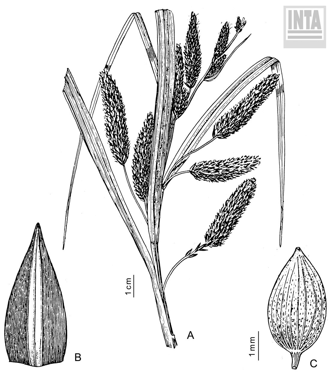 Rizoma estolonífero. Tallo de 40-60 cm de alto, de ángulos agudos, subalados, escabrosos. Hojas del largo del tallo, de 4 mm de ancho. Espigas cortamente pediceladas o sésiles en número de 7-9, cilíndricas, aproximadas, una o dos de las superiores masculinas, las restantes femeninas (a veces con algunas flores masculinas en el ápice), reunidas de a dos o de a tres en la axila de las brácteas; brácteas más largas que el tallo; glumas femeninas ovales obtusas, de color púrpura negruzco, pálidas en la carina. Utrículos más largos y más anchos que las glumas, elípticos, plano-convexos de 3,5 mm, nervados en ambas caras, densamente punteados, estipitados, de rostro corto, entero; estigmas 2.