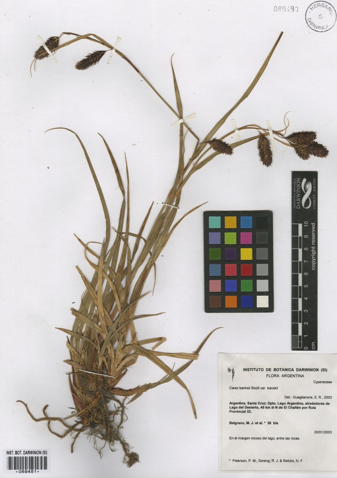 Rizoma estolonífero. Tallo de 10-80 cm de alto, obtusángulo. Hojas más cortas que el tallo, de 4-10 mm de ancho, terminadas en acumen triquetro. Espigas 3-5, rara vez más, oblongas, de 1,5-3 cm, densifloras, las superiores brevemente pedunculadas, las inferiores separadas, más largamente pedunculadas, nutantes, la terminal ginecandra o masculina, las laterales femeninas; glumas purpúreo-negruzcas, aristadas. Utrículos más anchos que las glumas, elípticos o suborbiculares, aplanados, papiráceos, de 5-7 mm, terminados en rostro purpúreo de boca bidentada; estigmas 3, largamente exertos. Aquenio elíptico u ovoide con un estípite de largo igual a la mitad del aquenio.